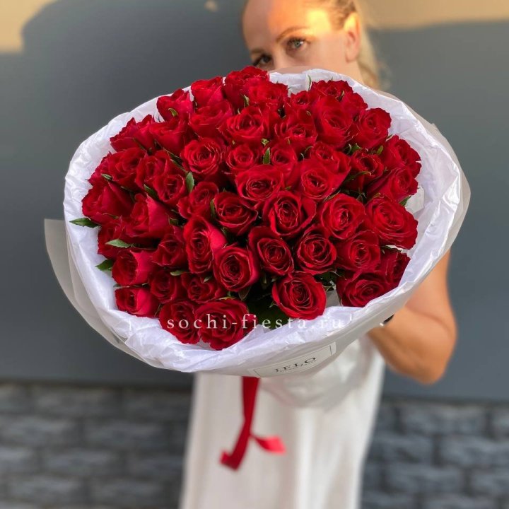 51 роза мадам ред в нежном оформлении