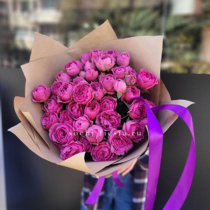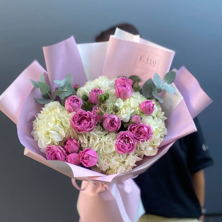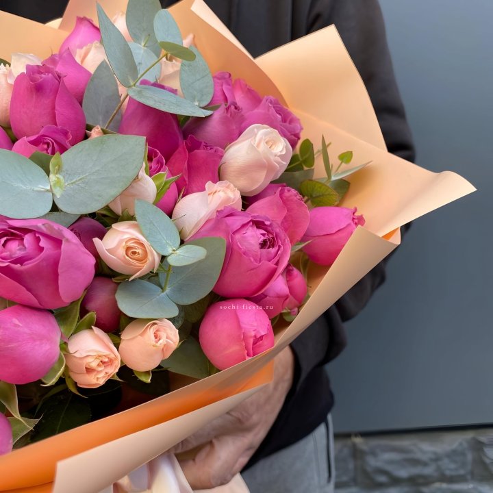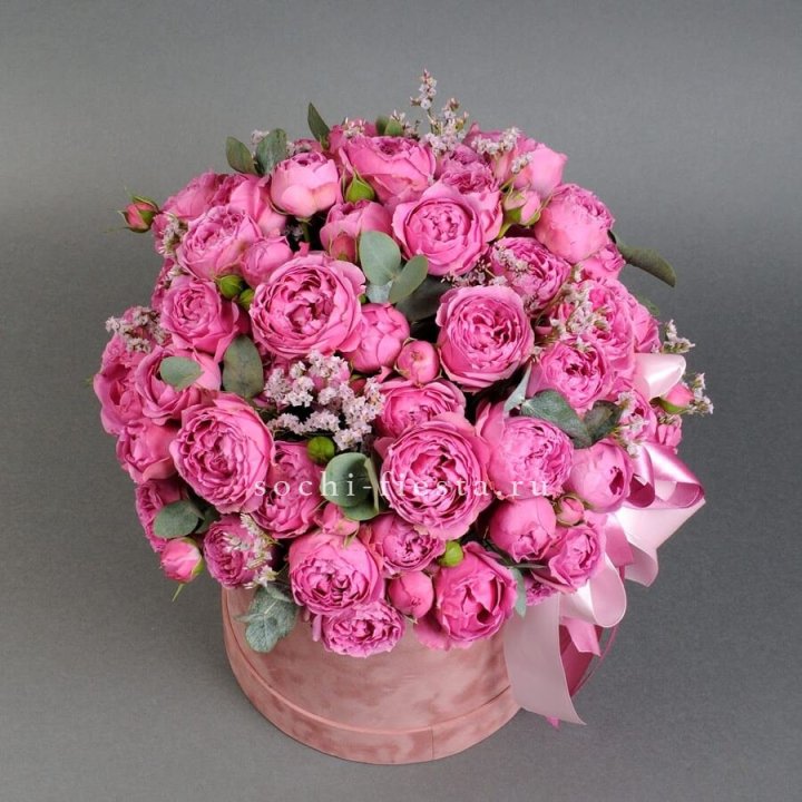 Цветочная корзина из пионов и пионовидных роз "Юниверсити"