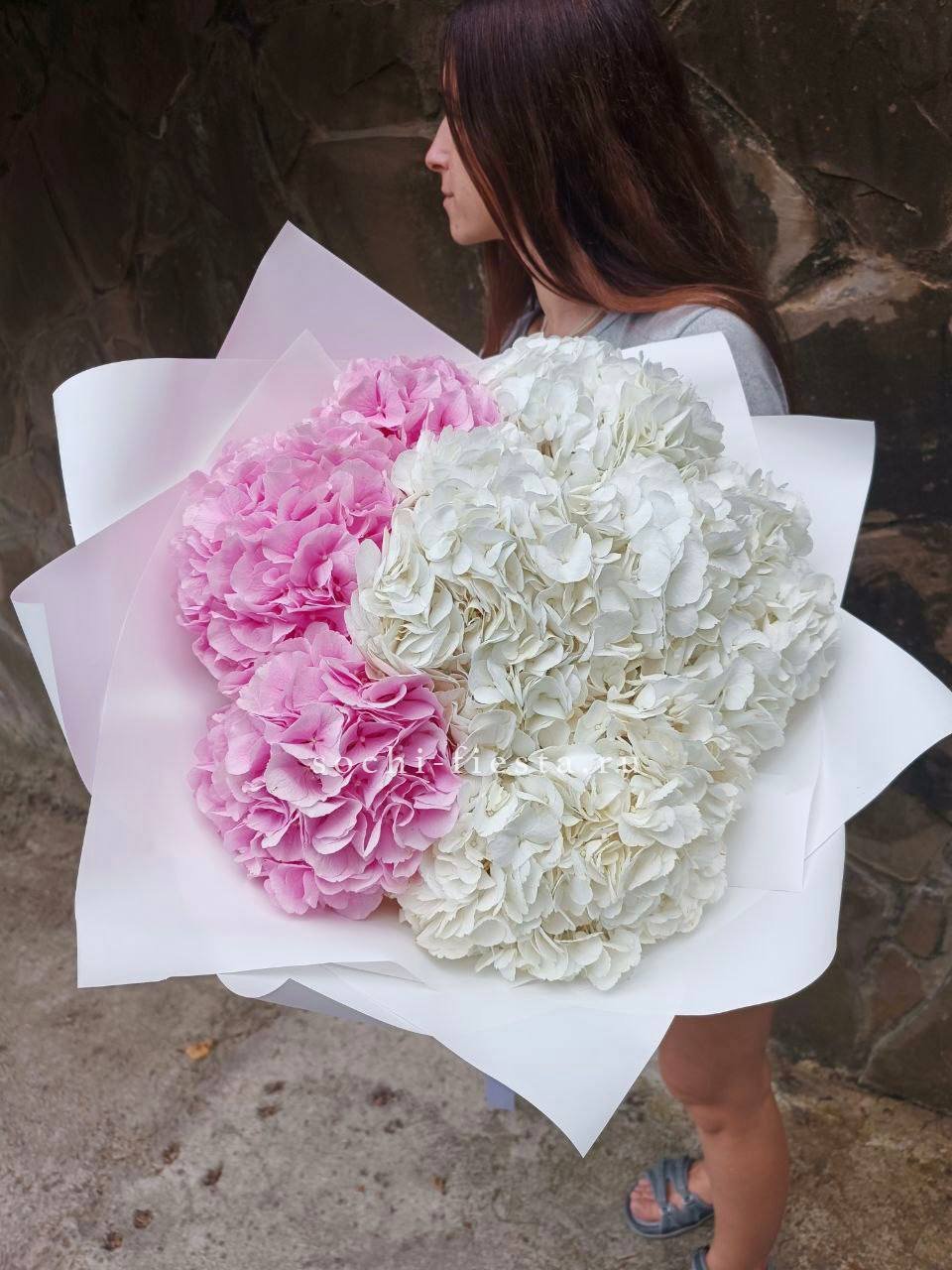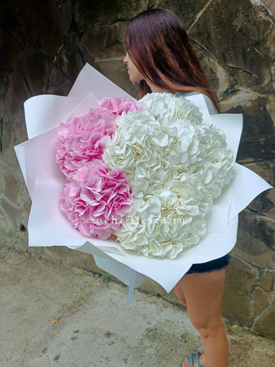 Семь пышных шапок гортензий собраны в природном джутовом кашпо. Плотные соцветия создают облачную текстуру, где каждый бутон дополняет общий объем. Композиция готова к размещению на столе или комоде без дополнительных усилий.