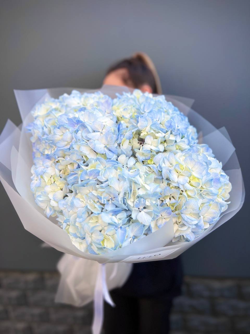 Пышные соцветия гортензии формируют плотное облако, которое занимает все пространство букета. Эустома добавляет воздушные акценты по краям композиции.