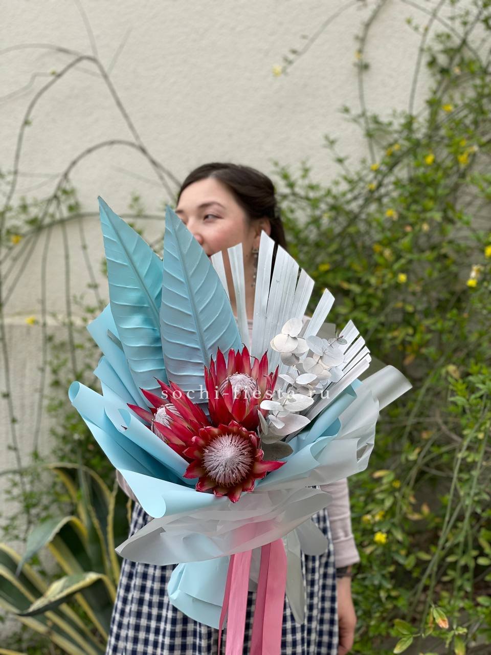 Три крупных соцветия протеи образуют графичную композицию с выраженной архитектурой. Сезонная зелень усиливает структурность линий и создаёт визуальную глубину. Букет для пространств с современной эстетикой и смелыми акцентами.