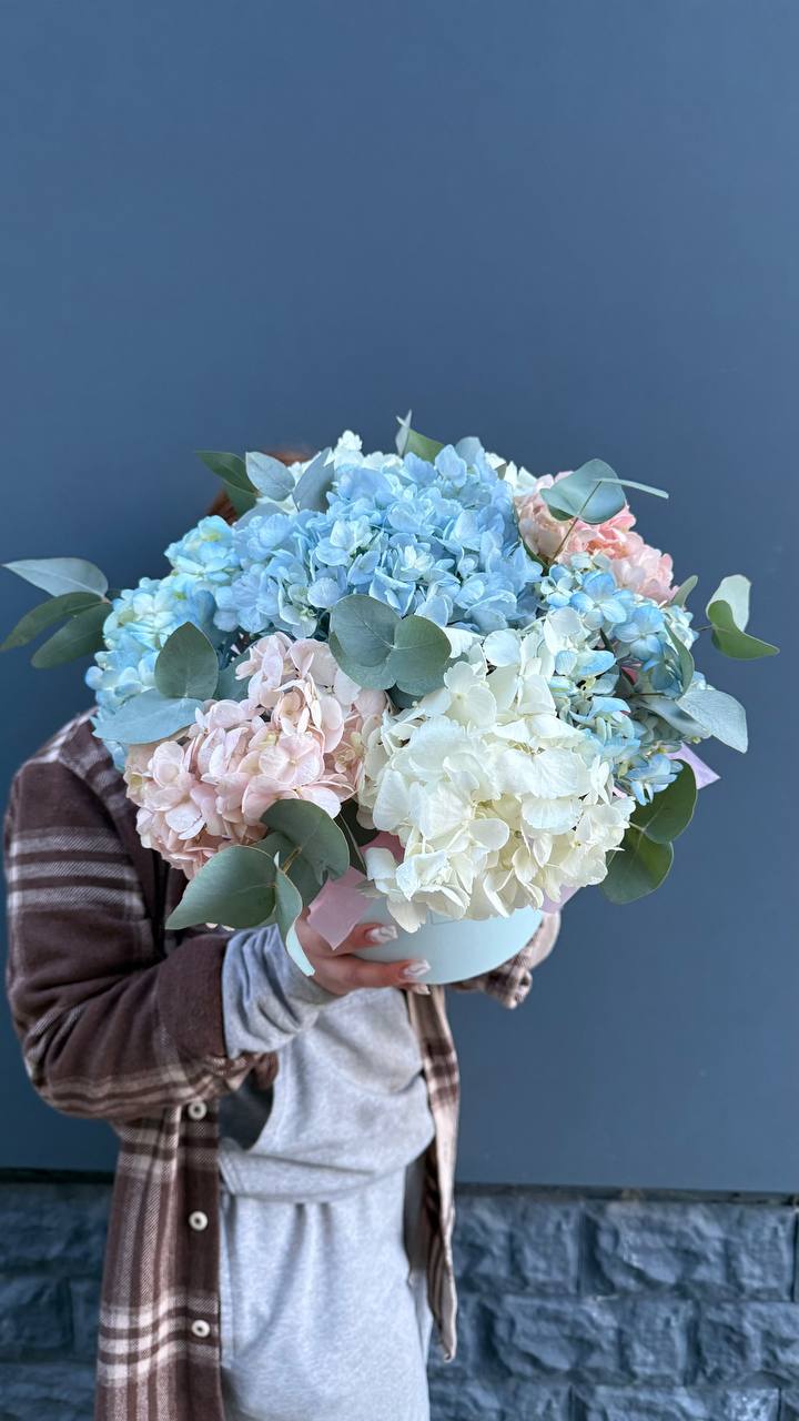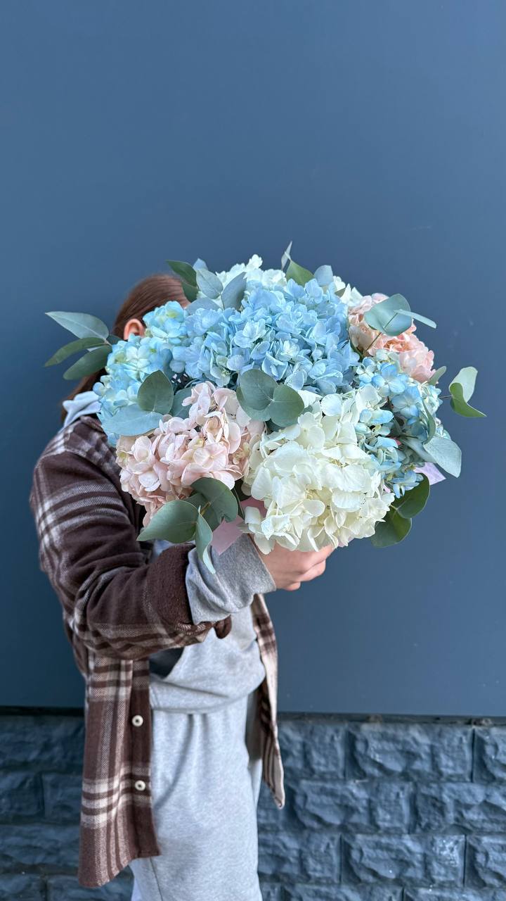 Букет из семи гортензий объединяет разные оттенки в единую композицию с живым ритмом. Переходы цвета создают динамику, а плотные соцветия формируют выразительный объём.