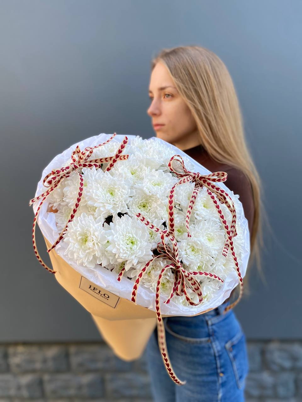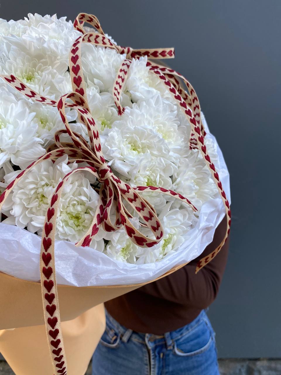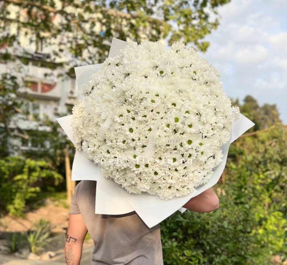 Девятнадцать веток белоснежных хризантем собраны в плотный купол. Множество мелких соцветий создают объёмную текстуру, словно морозный узор. Монохром в чистом виде для минималистичного интерьера.
