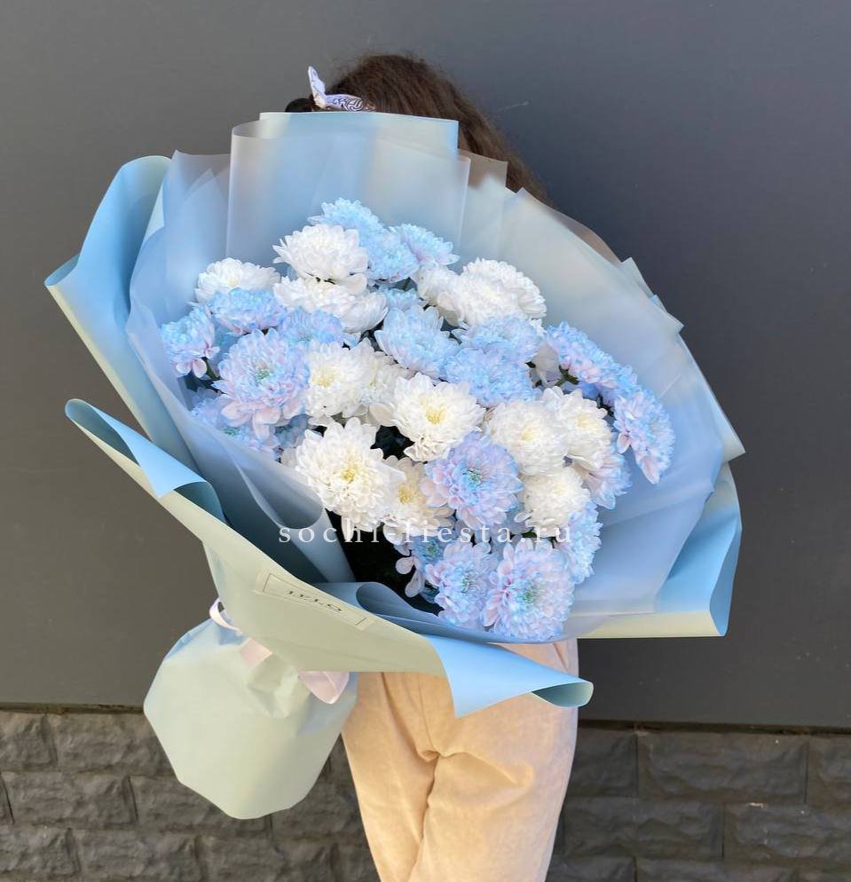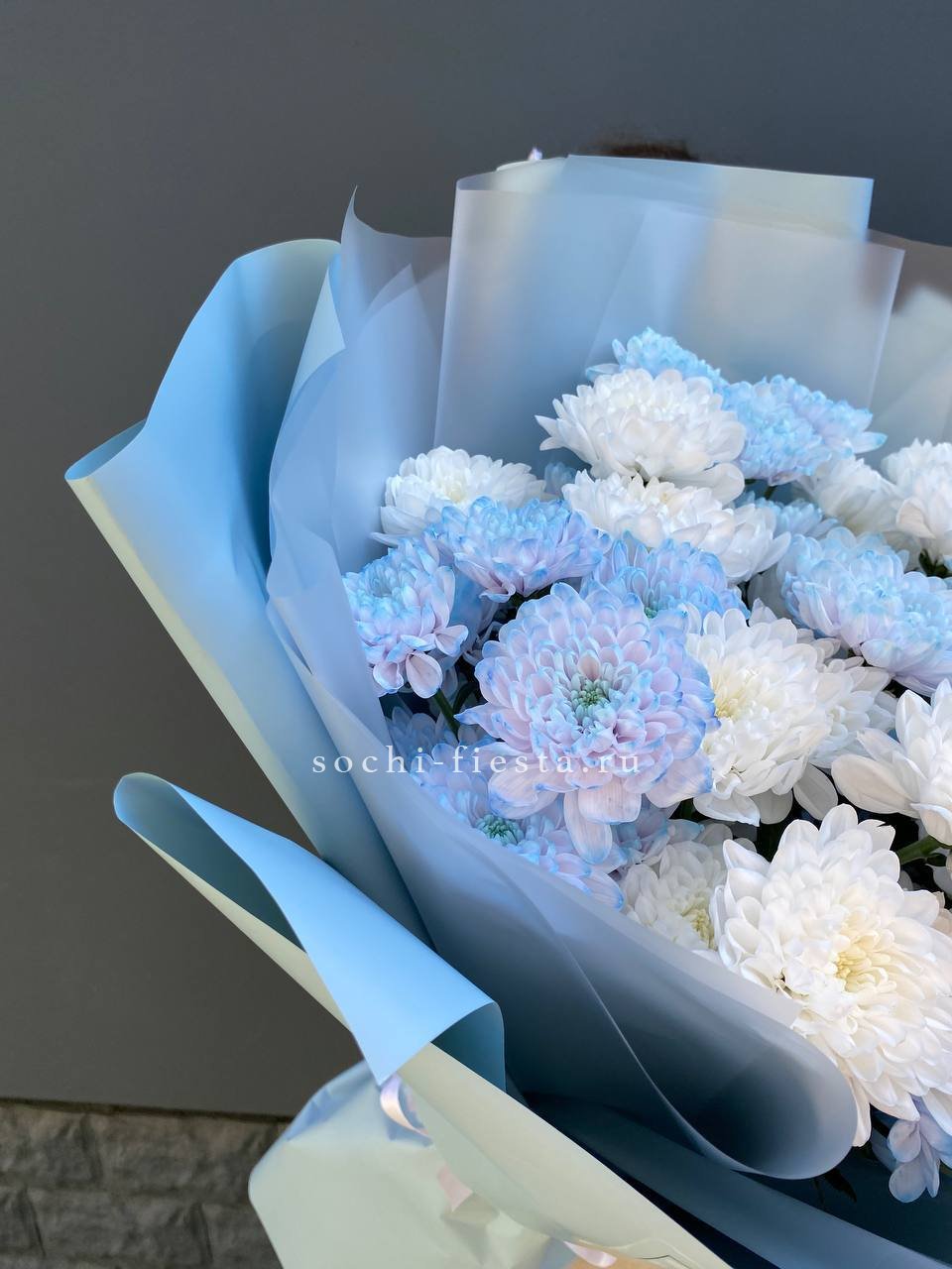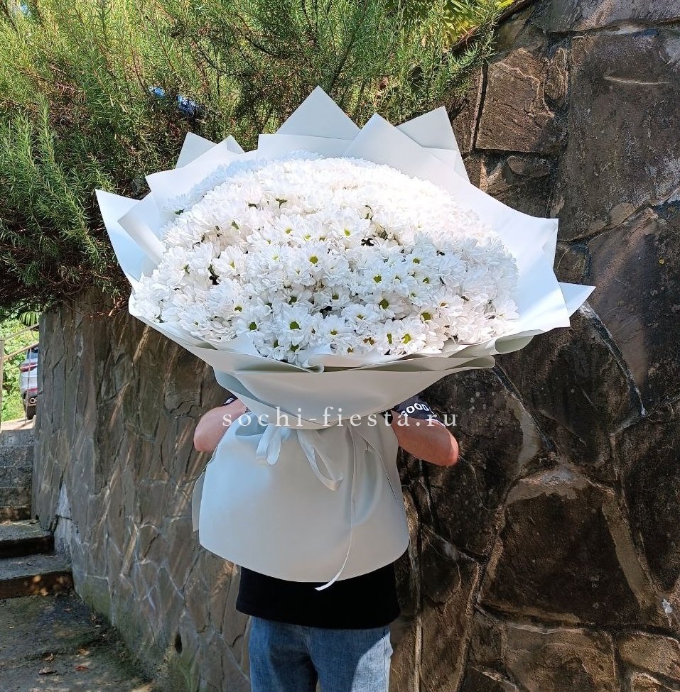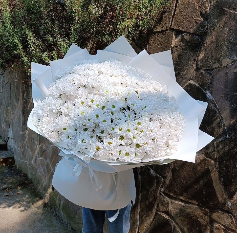 Девятнадцать веток белоснежных хризантем собраны в плотный купол. Множество мелких соцветий создают объёмную текстуру, словно морозный узор. Монохром в чистом виде для минималистичного интерьера.