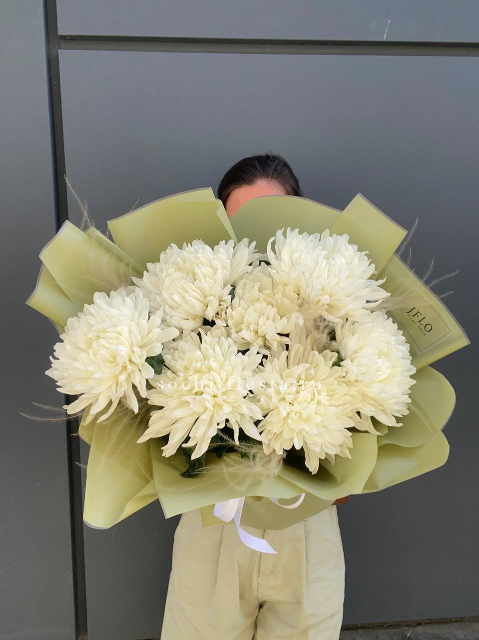 Крупные головки хризантем дополнены воздушными метёлками ковыля. Лаконичная упаковка сохраняет естественную красоту цветов и позволяет разместить букет в любом пространстве.