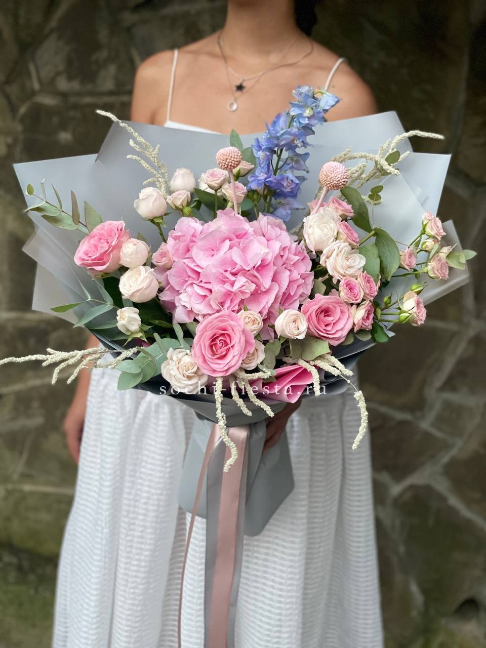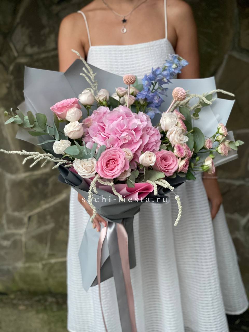 гортензия, диантус, кустовая пионовидная роза, эустома, орхидеи (или аналог), эвкалипт, лента, дизайнерская упаковка.