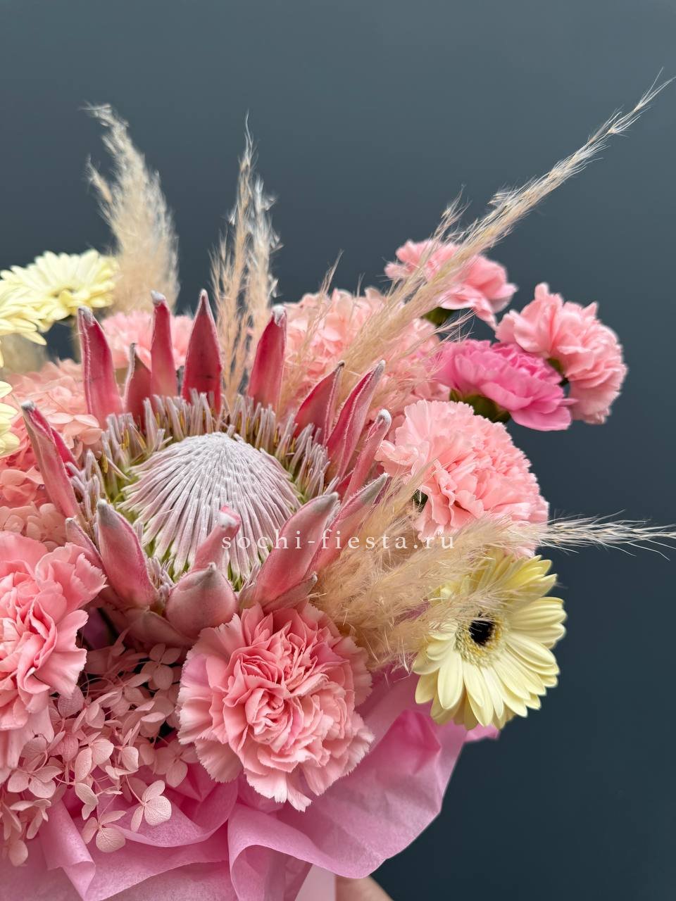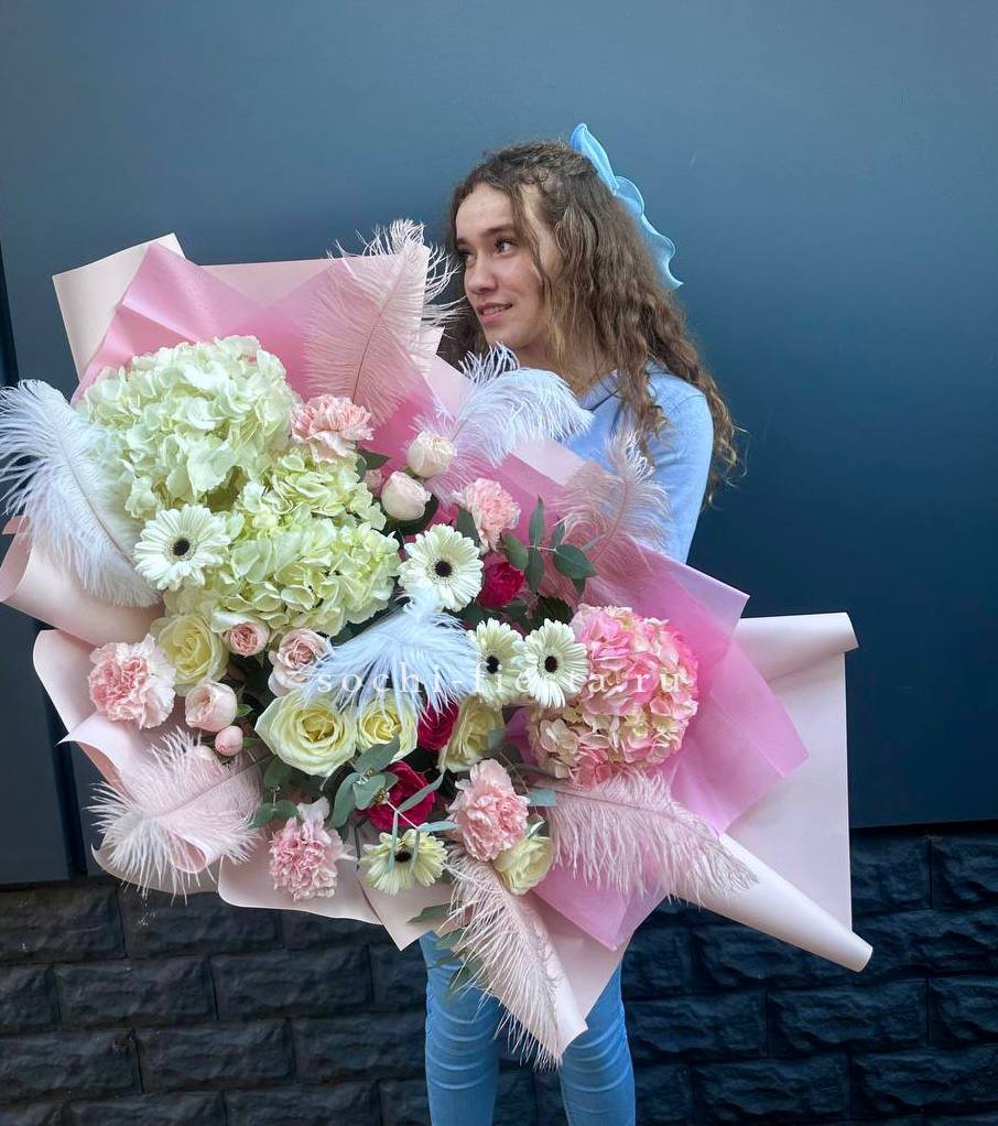 гортензии, роза одноголовая, роза кустовая, гербера, озотамнус, диантус, эвкалипт, декоративные перья, лента, дизайнерская упаковка.