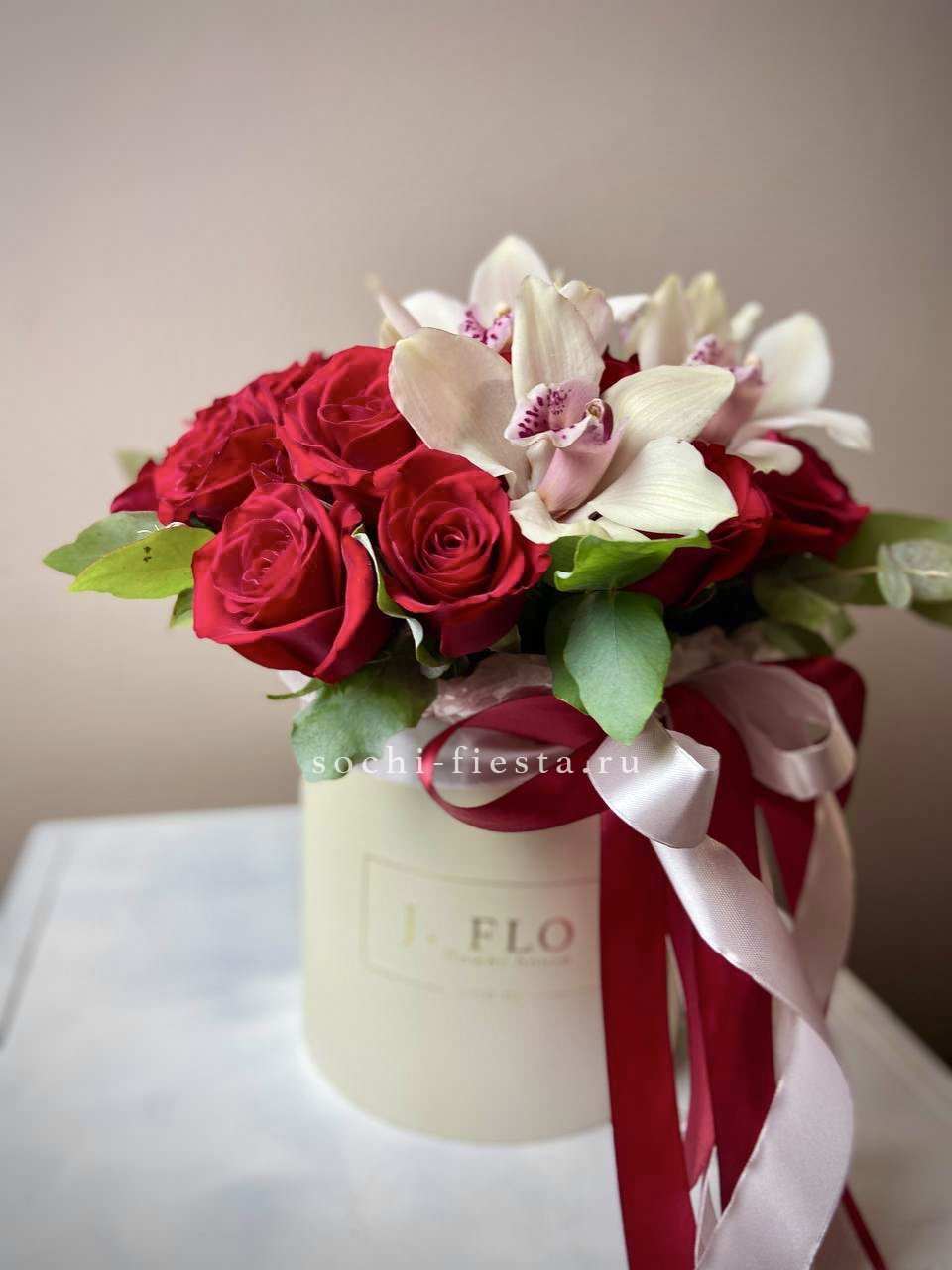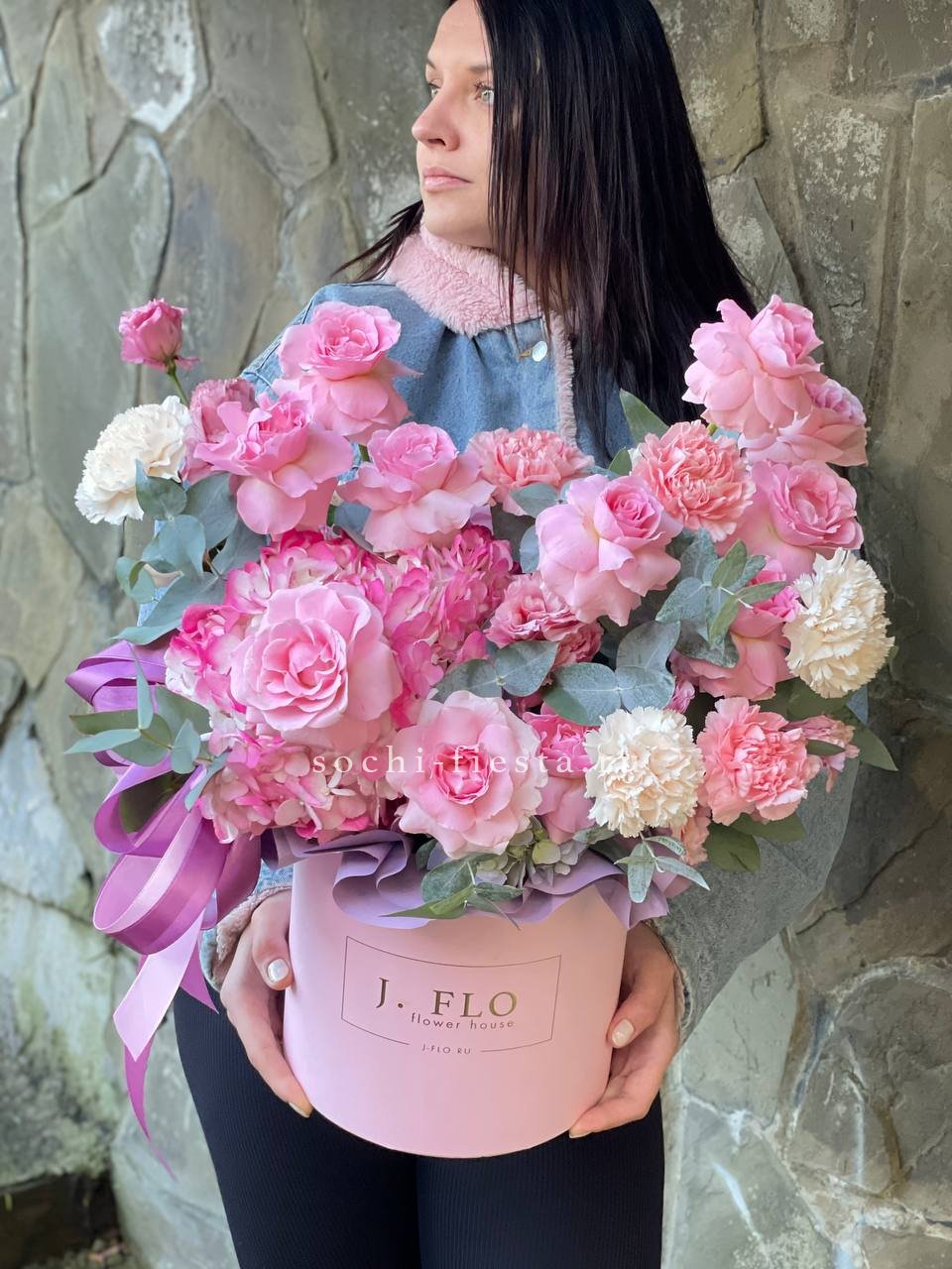 Перья и амарантус добавляют композиции воздушности и движения между французскими розами и хризантемами. Эустома и диантусы смягчают силуэт и создают многослойную фактуру в высоком боксе.