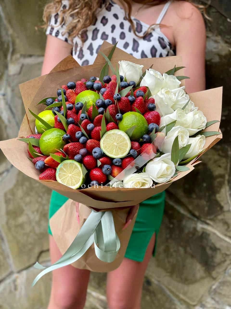 1300 г. ароматной клубники и 200 г. голубики, 5 лаймов, розы- 11 шт., лента, оформление.