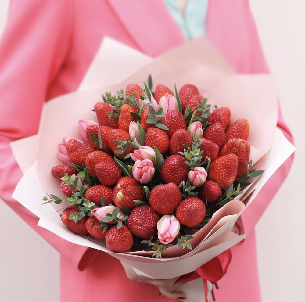Весенняя свежесть в каждом лепестке и ягоде. Десять тюльпанов в обрамлении спелой клубники создают яркую композицию для тех, кто любит неожиданные сочетания.