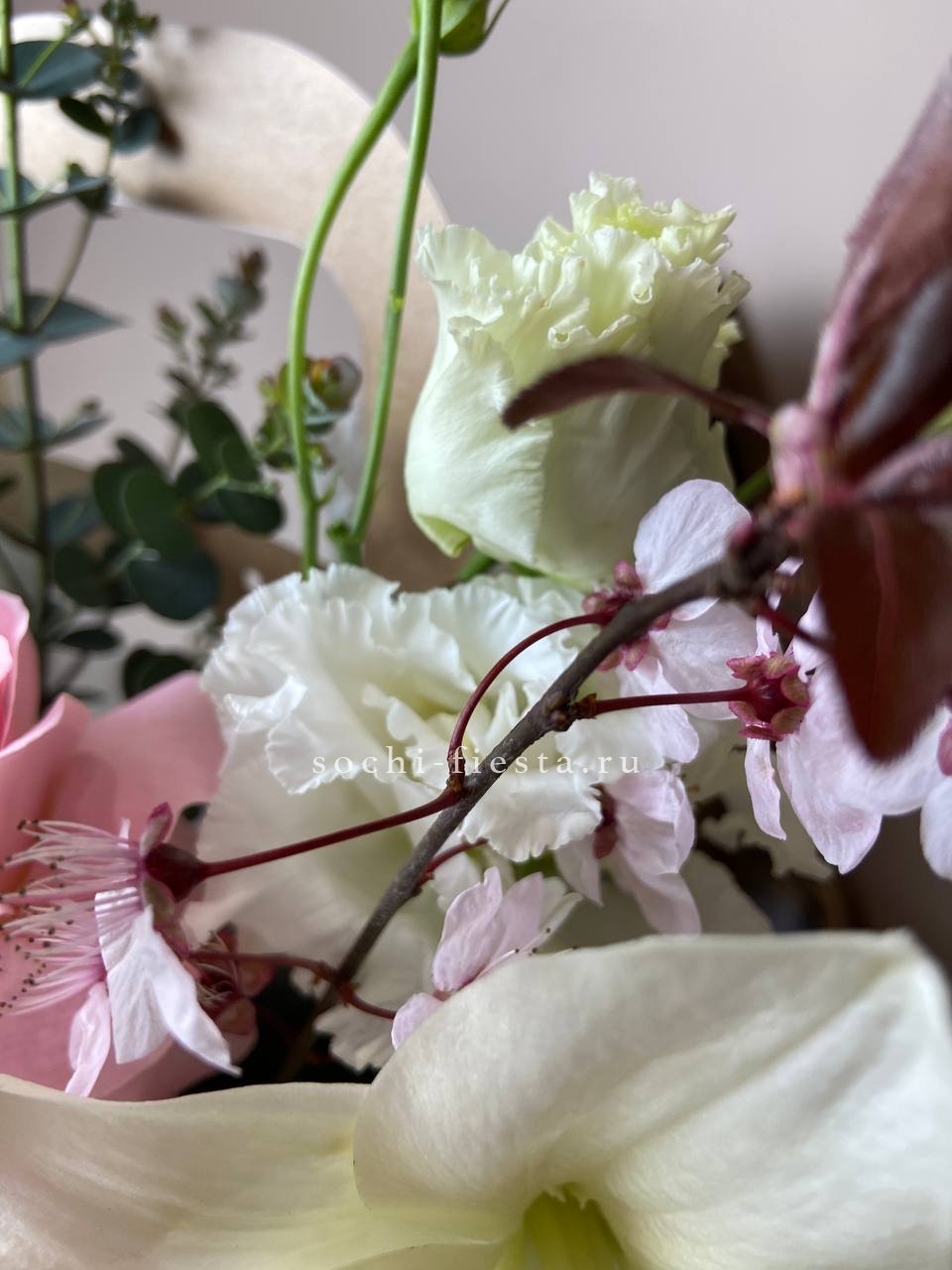 Белые розы и эустомы перекликаются с пастельными соцветиями гортензии, а озотамнус добавляет фактурные акценты. Эвкалипт обрамляет композицию серебристыми нотами.