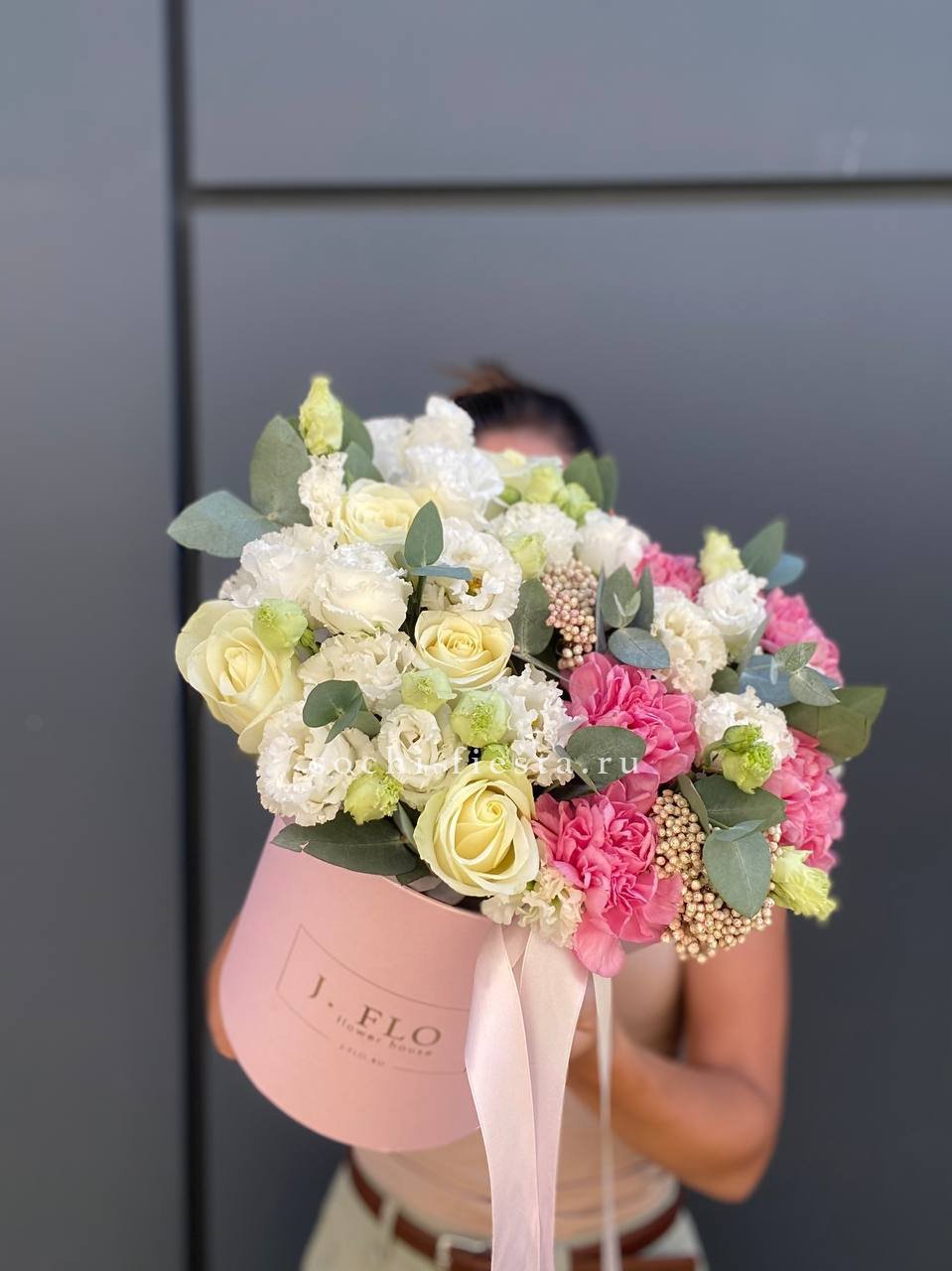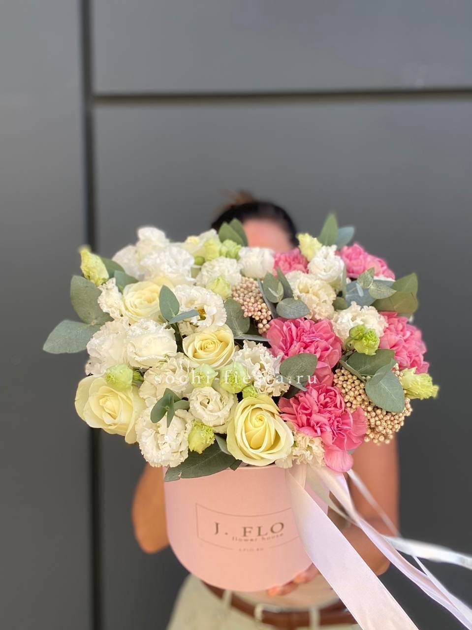 гортензия, эустома, диантусы, розы, эвкалипт и прочие цветы, гармонирующие по фактуре. Цветочная композиция в белых, нежно-сиреневых, розовых тонах в квадратном боксе D25.