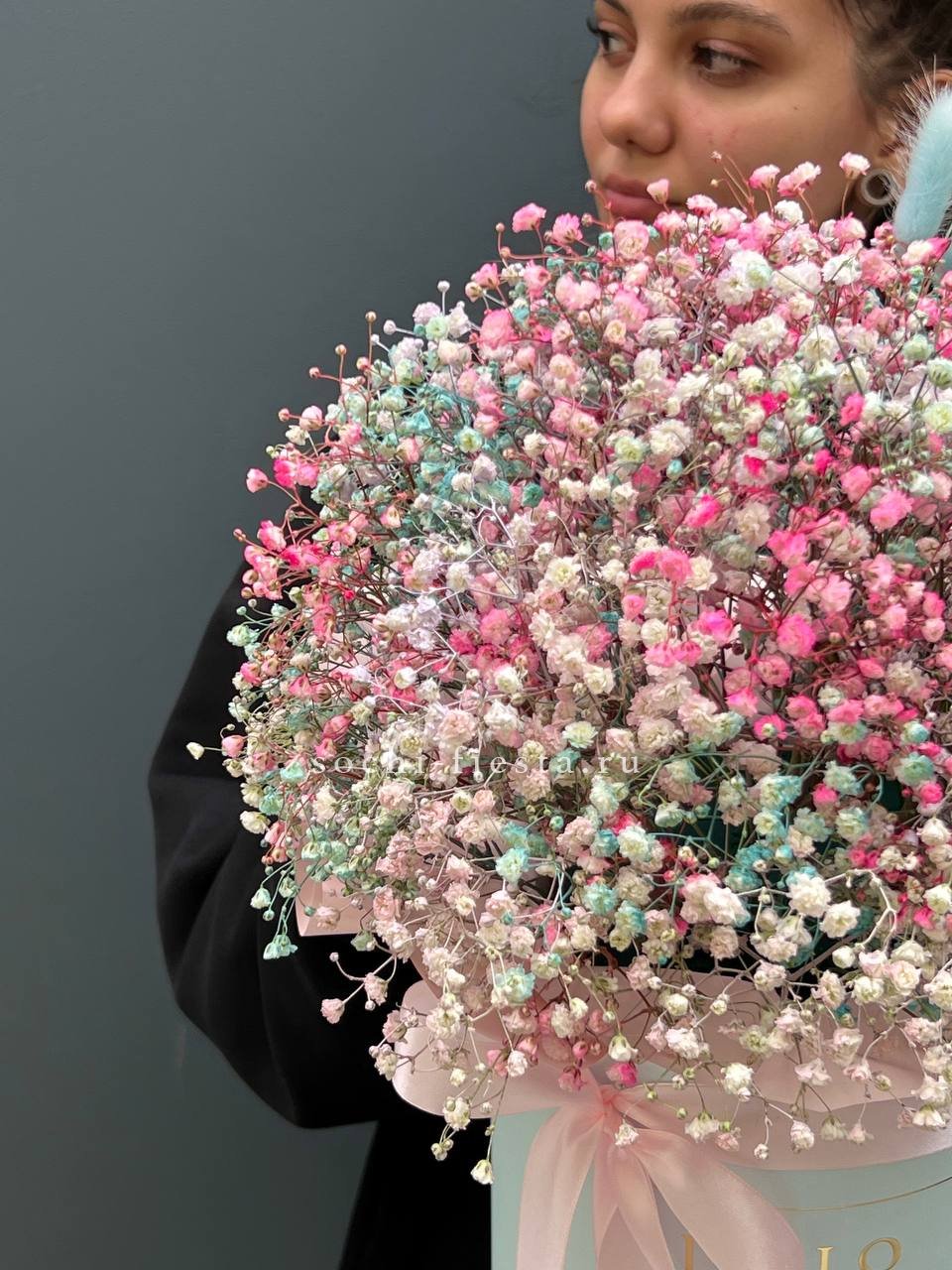 9 Радужных гипсофилы в шляпной коробке