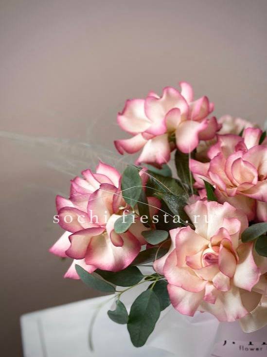 пионовидная кустовая роза Бомбастик, эвкалипт, лента, цилиндр D16.