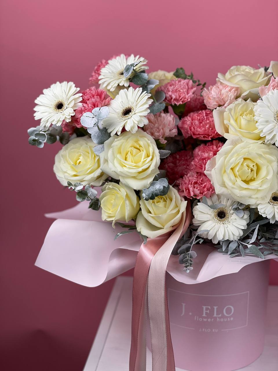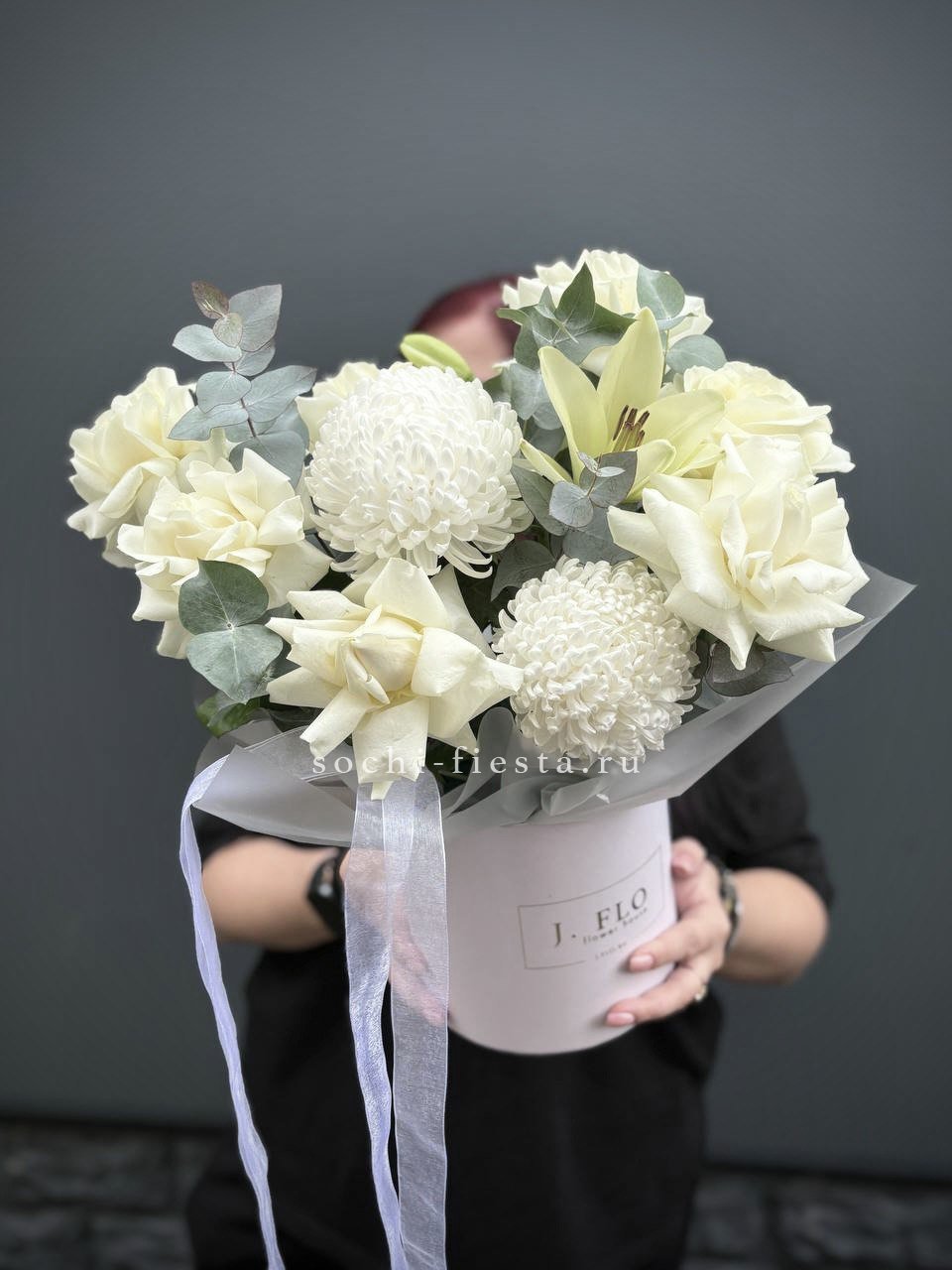 белые розы, диантусы, герберы, эвкалипт, бокс 20.