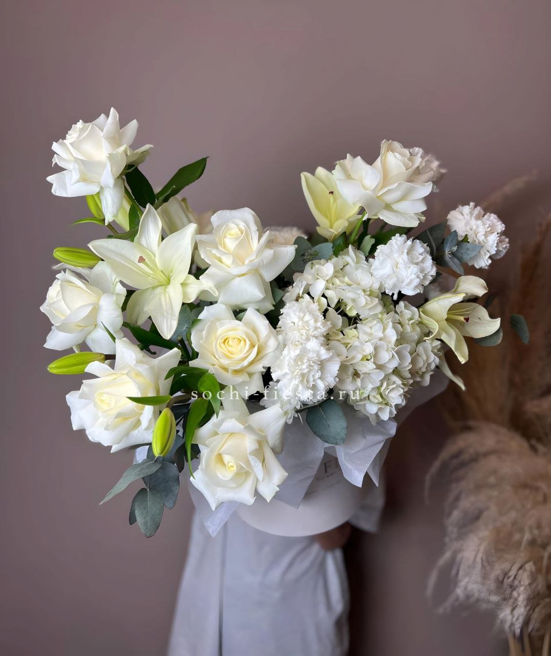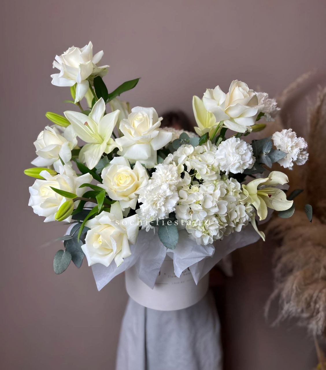Белоснежные розы переплетаются с воздушной эустомой и раскрытыми лилиями в аккуратной цветочной сумке. Эвкалипт создаёт прохладный фон для светлых бутонов. Композиция на оазисе сохраняет свежесть и форму долгое время.