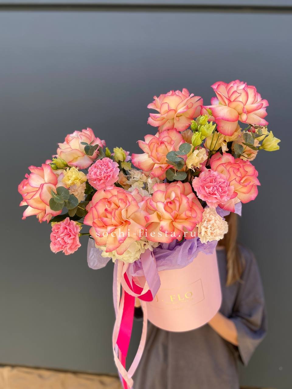 Гортензия заполняет пространство пышными соцветиями, розы и эустома расставляют акценты. Диантус и эвкалипт дополняют картину зеленью и мелкими деталями. Компактная форма удобна для размещения.
