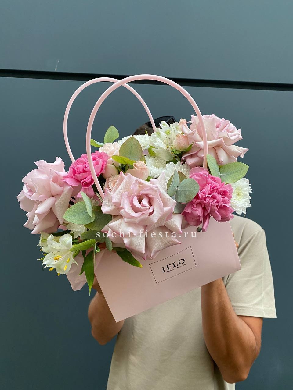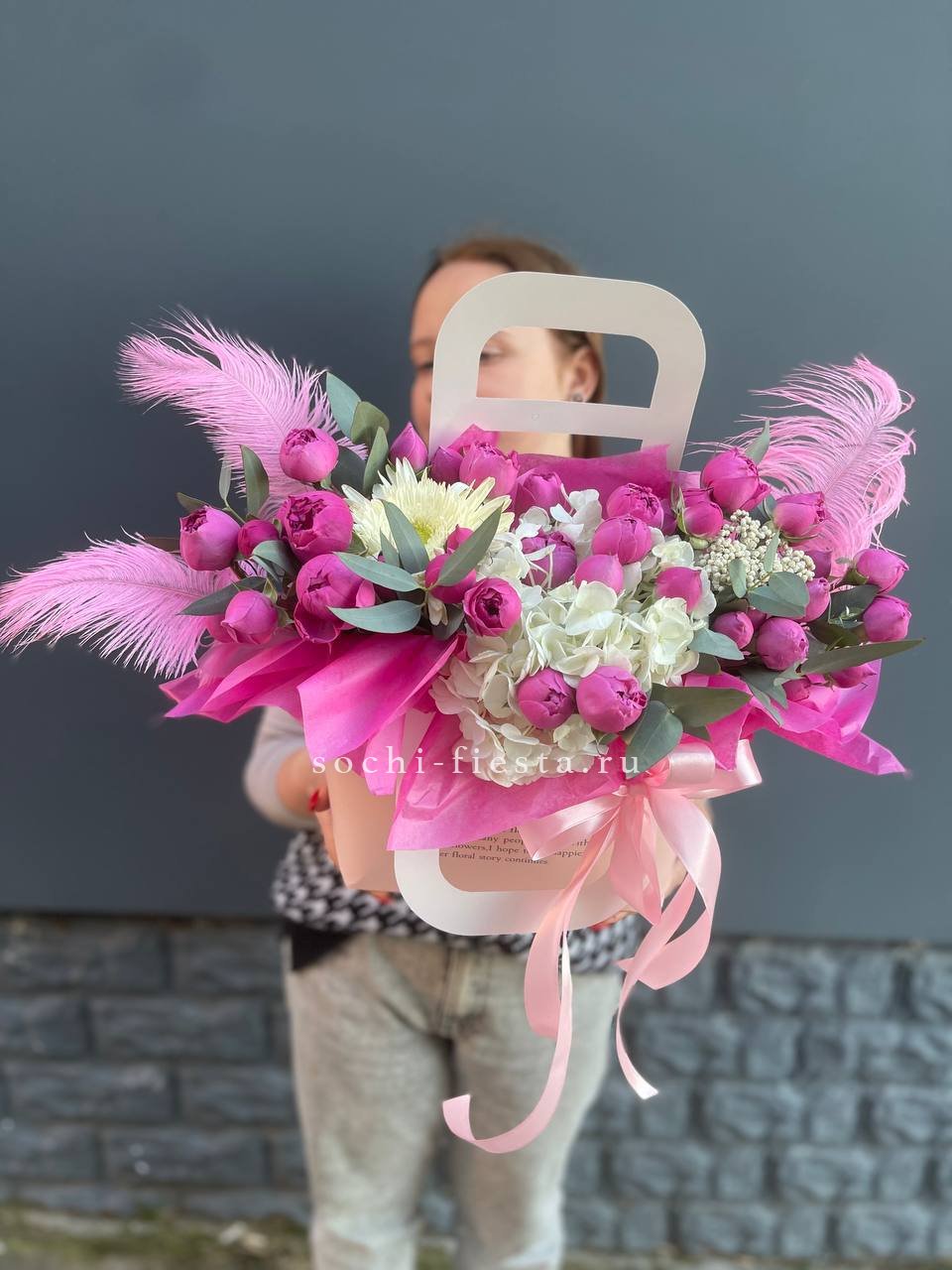 гортензия, розы, эустома, эвкалипт, диантус, лента, сумка.