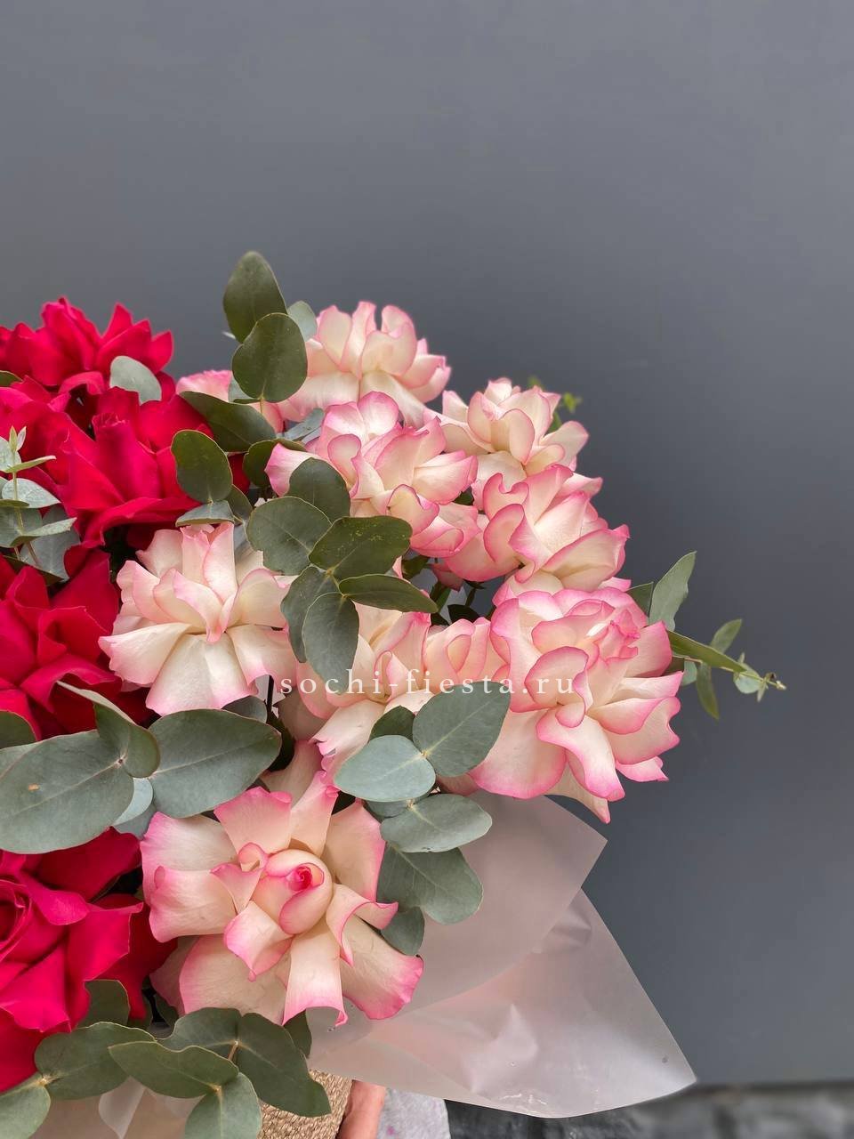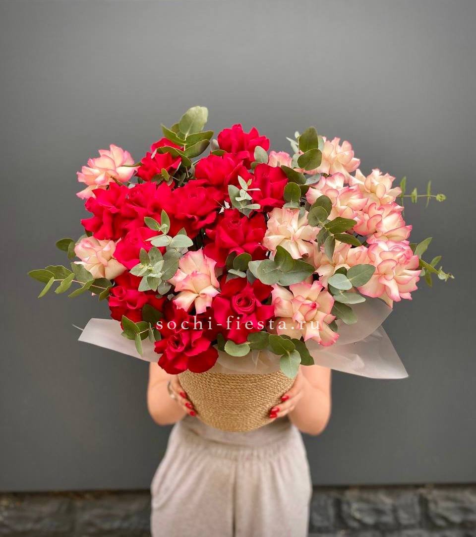 Французские розы двух оттенков собраны плотной шапкой в компактной сумочке. Белый и красный создают чёткий визуальный ритм без лишних деталей. Формат удобен для подарка или украшения пространства.