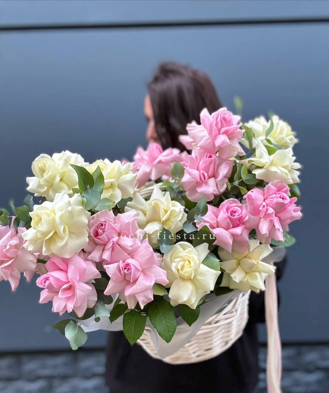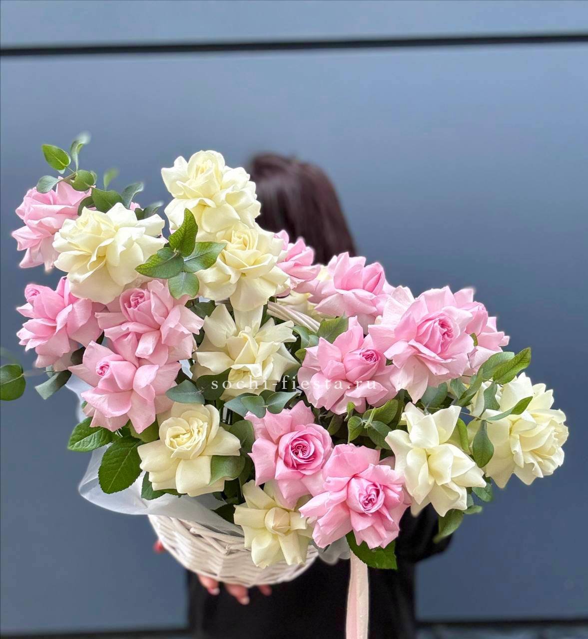 гортензия нежно-розовых оттенков, эустома, лилии, диантус, кустовая роза, эвкалипт, вспомогательная зелень, лента, светлая корзина.