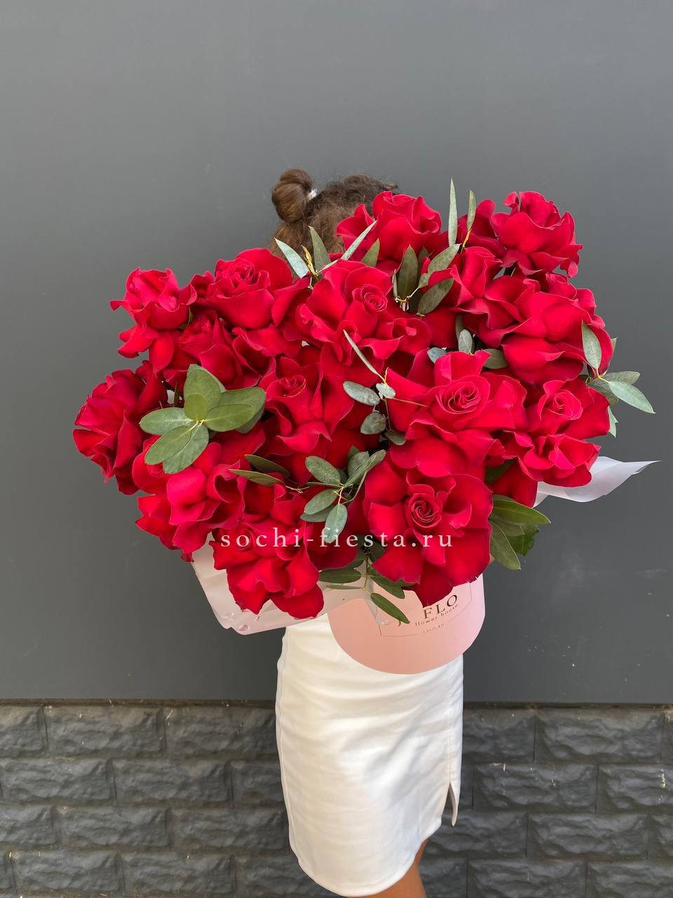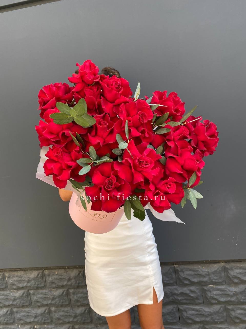 розы одноголовые, розы кустовые, эустома, фисташка или эвкалипт, пиафлор, лента, корзина D35.