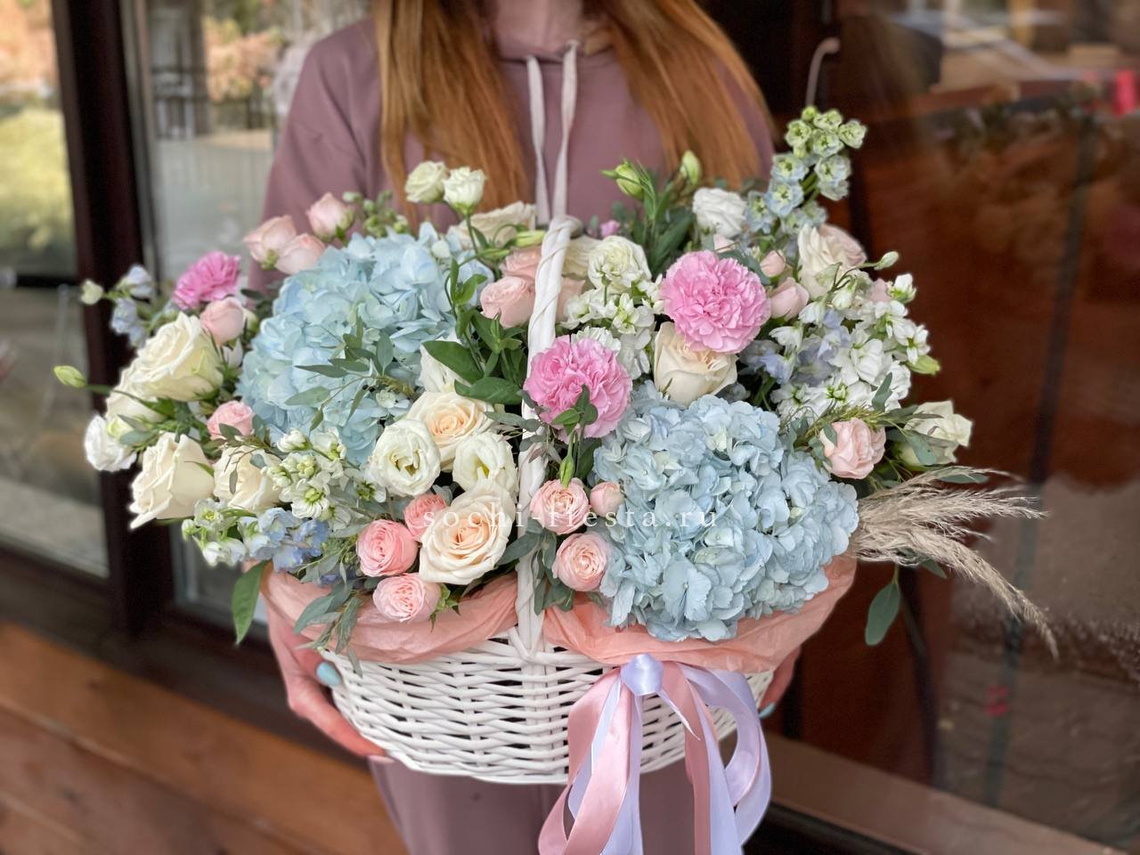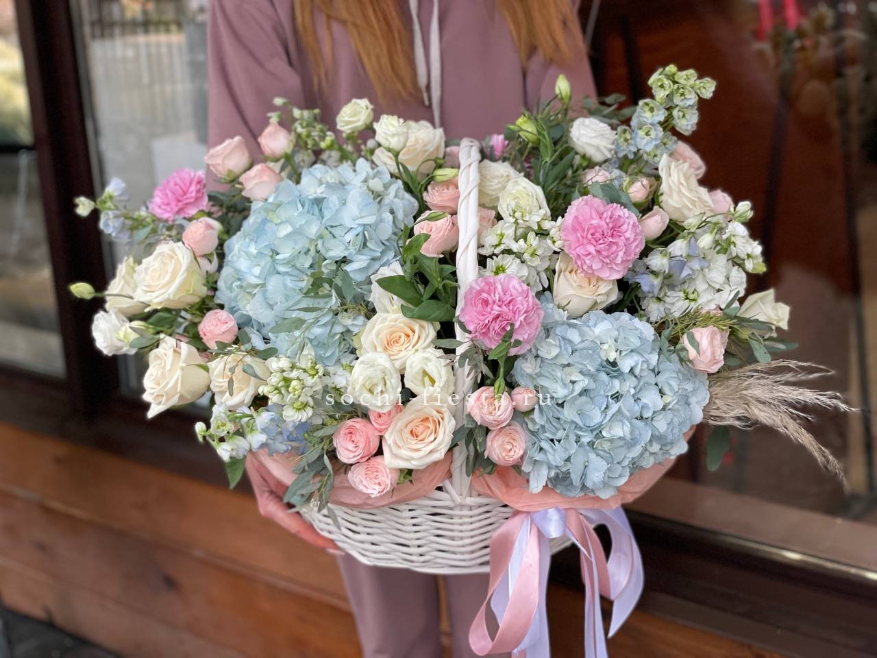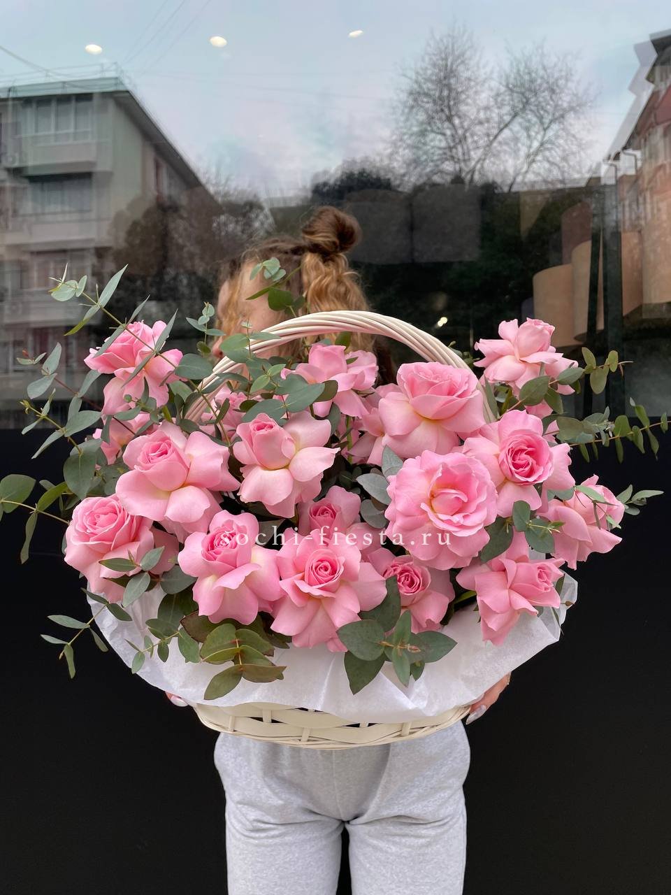 Пышная композиция в корзине собрана из роз двух видов и воздушной эустомы в бело-розовой гамме. Фисташка добавляет свежести, а округлая форма создает ощущение наполненности и объема.