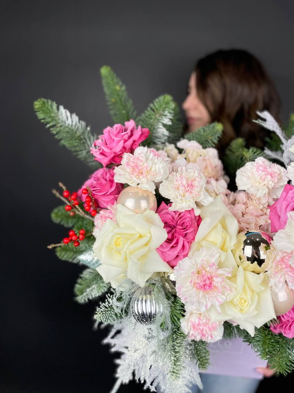 Пионовидные розы Country Blue раскрываются рядом с веточками датского нобилиса и глянцевым илексом. В квадратном боксе соседствуют цветы и ёлочные украшения. Готовая композиция с зимним характером.