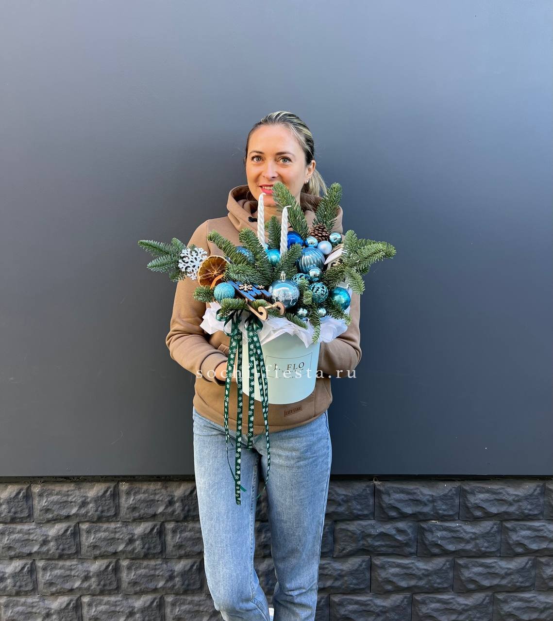 Компактная композиция в синей гамме собирает вокруг свечей ветки нобилиса и праздничные украшения. Цилиндрическая форма удобно размещается на столе или комоде. Живая хвоя сохраняет свежесть на протяжении всех праздников.