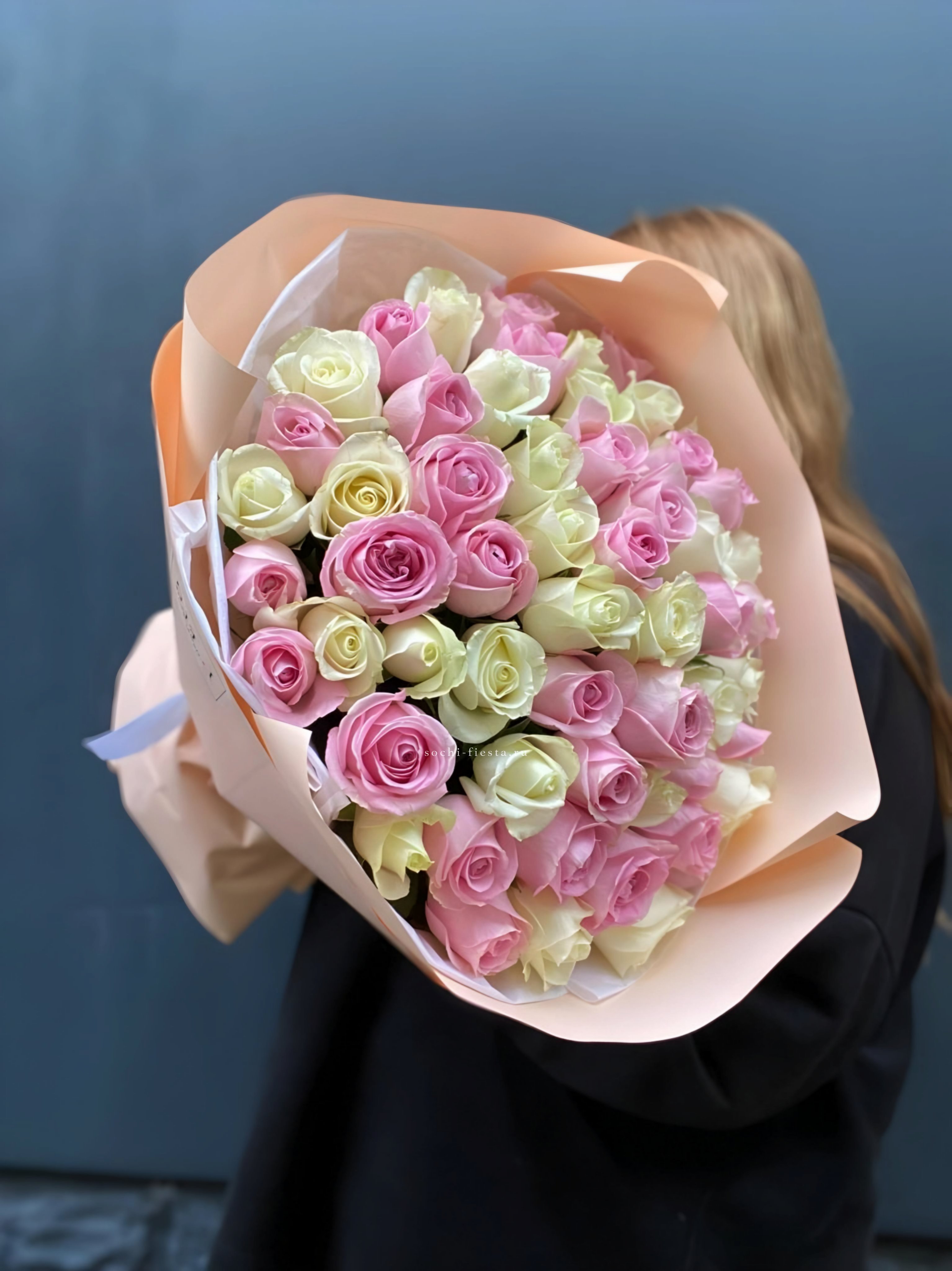 Сорок пять бутонов формируют пышную композицию с заметным присутствием в любом пространстве. Красные и белые розы раскрываются постепенно, сохраняя свежесть несколько дней.