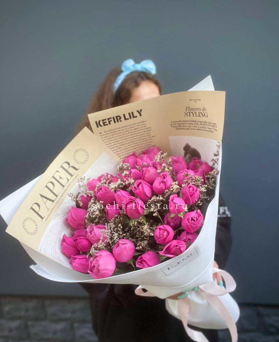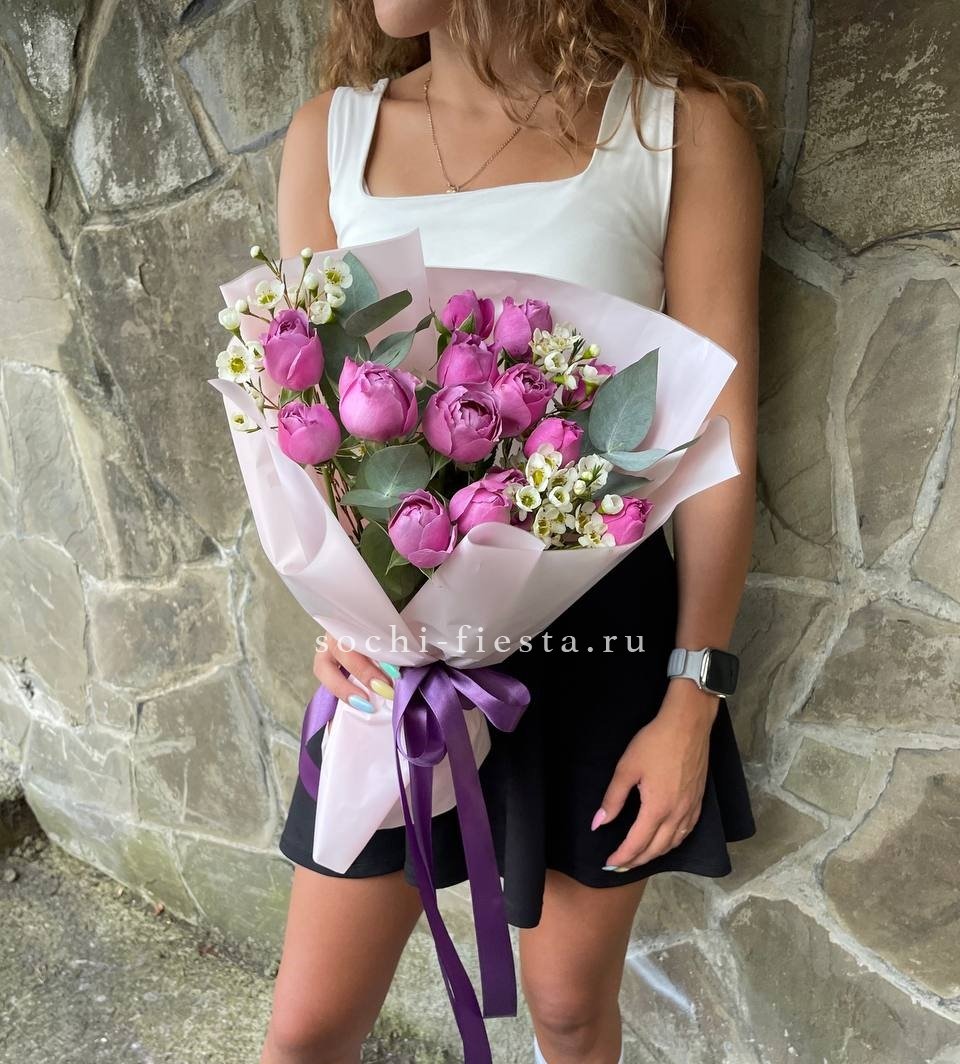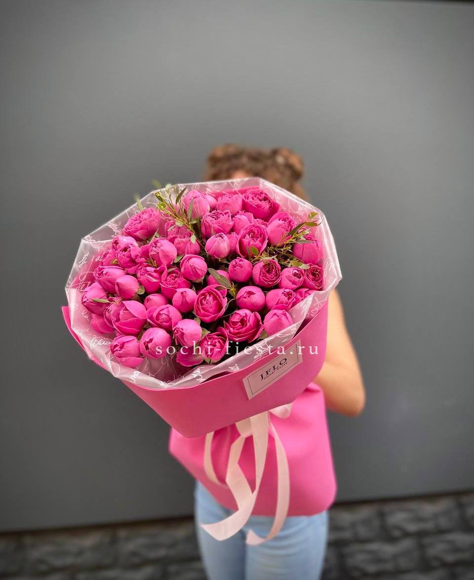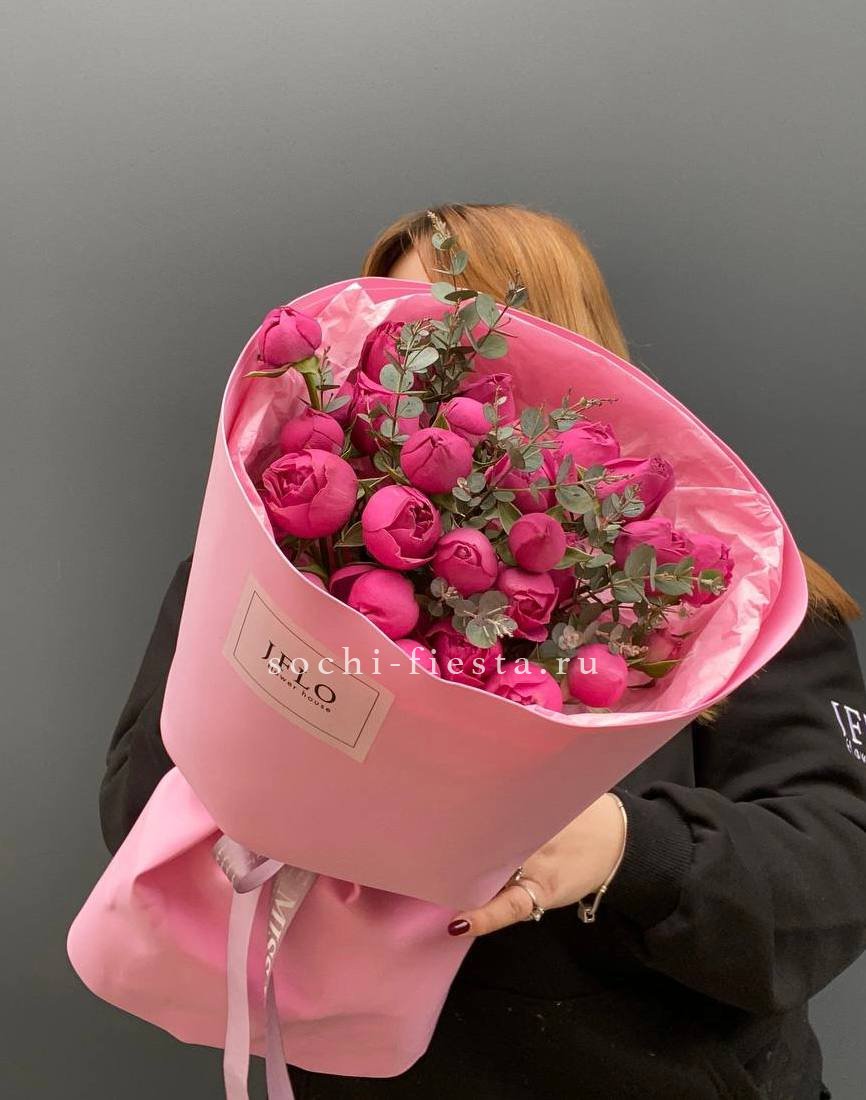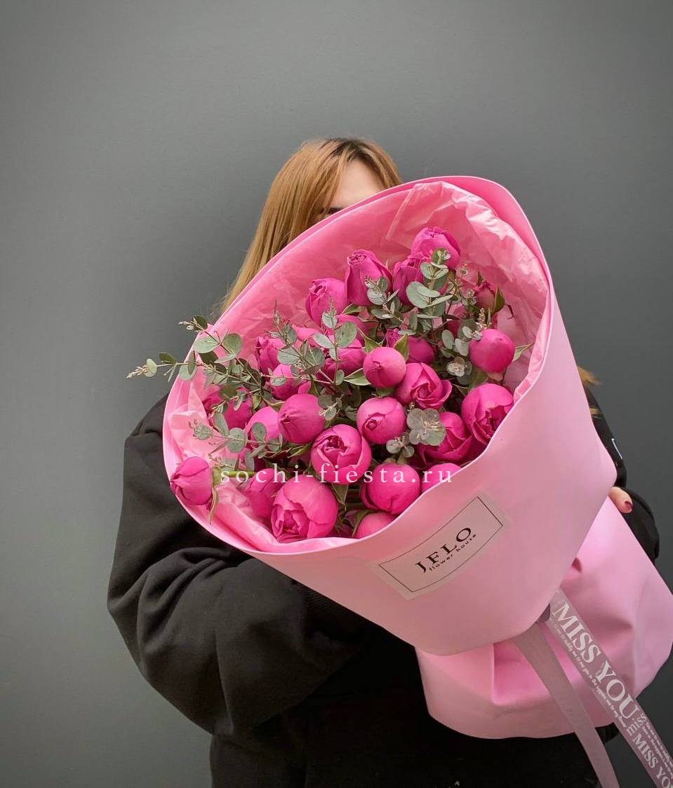 19 веток  пионовидных роз мисти баблс, лента, дизайнерская упаковка.