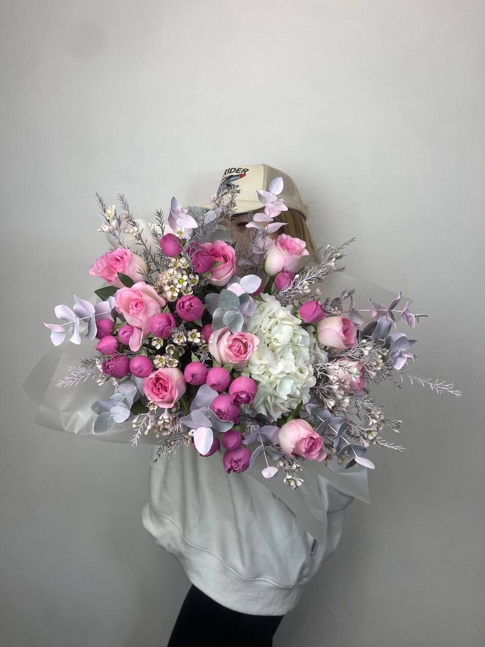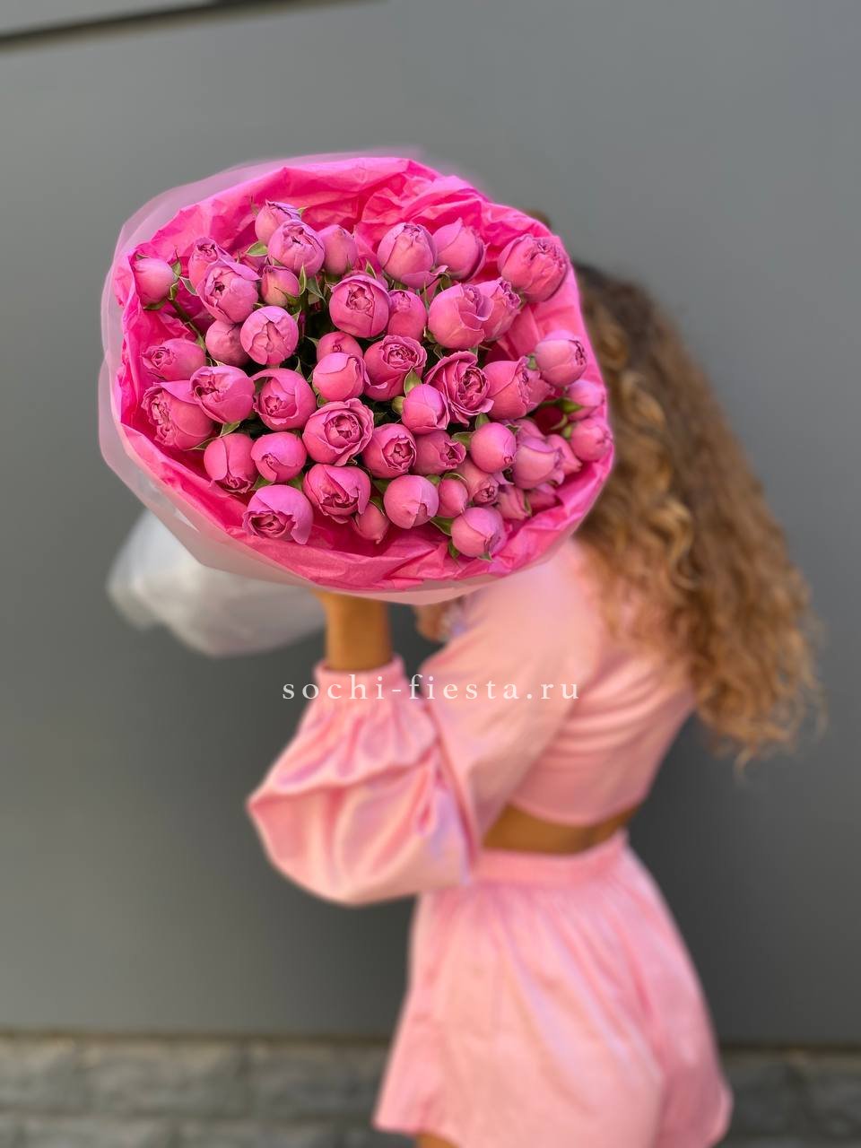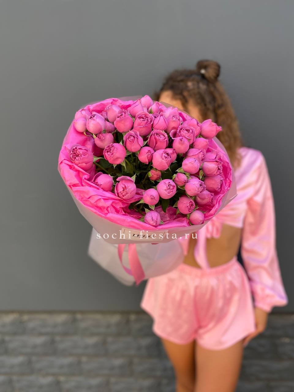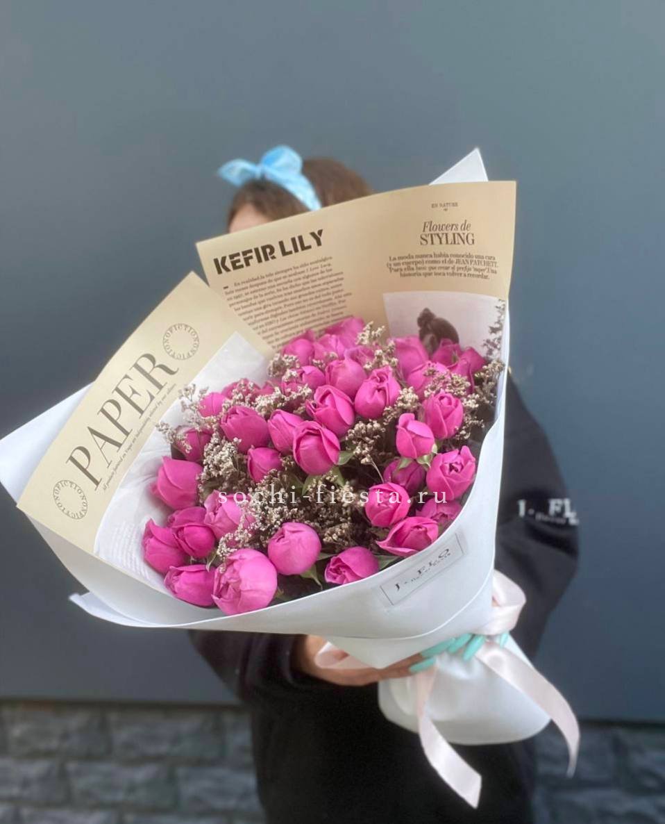 19 веток  пионовидных роз мисти баблс, лента, дизайнерская упаковка.