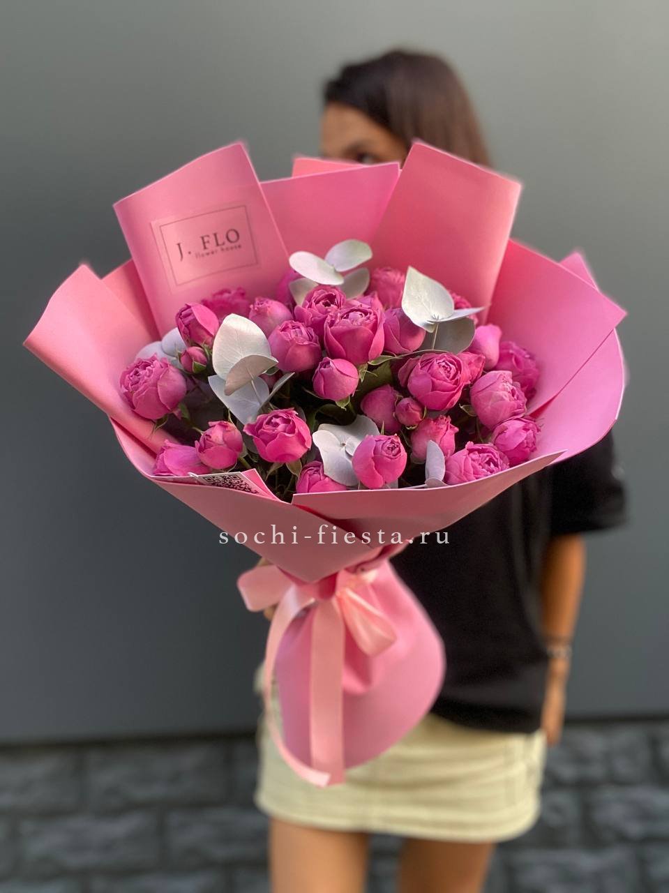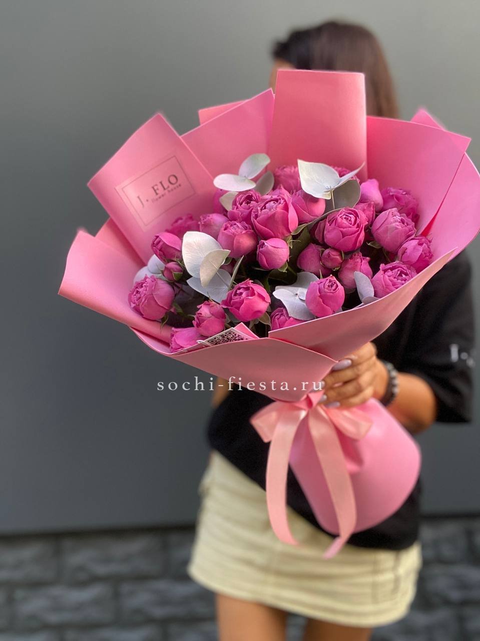 Пятнадцать роз Мисти Бабблс с пышными многослойными бутонами создают объёмную композицию с живой текстурой. Лепестки раскрываются волнами, образуя плотную шапку с мягкими переходами оттенков. Веточка эвкалипта добавляет свежести и завершает образ.