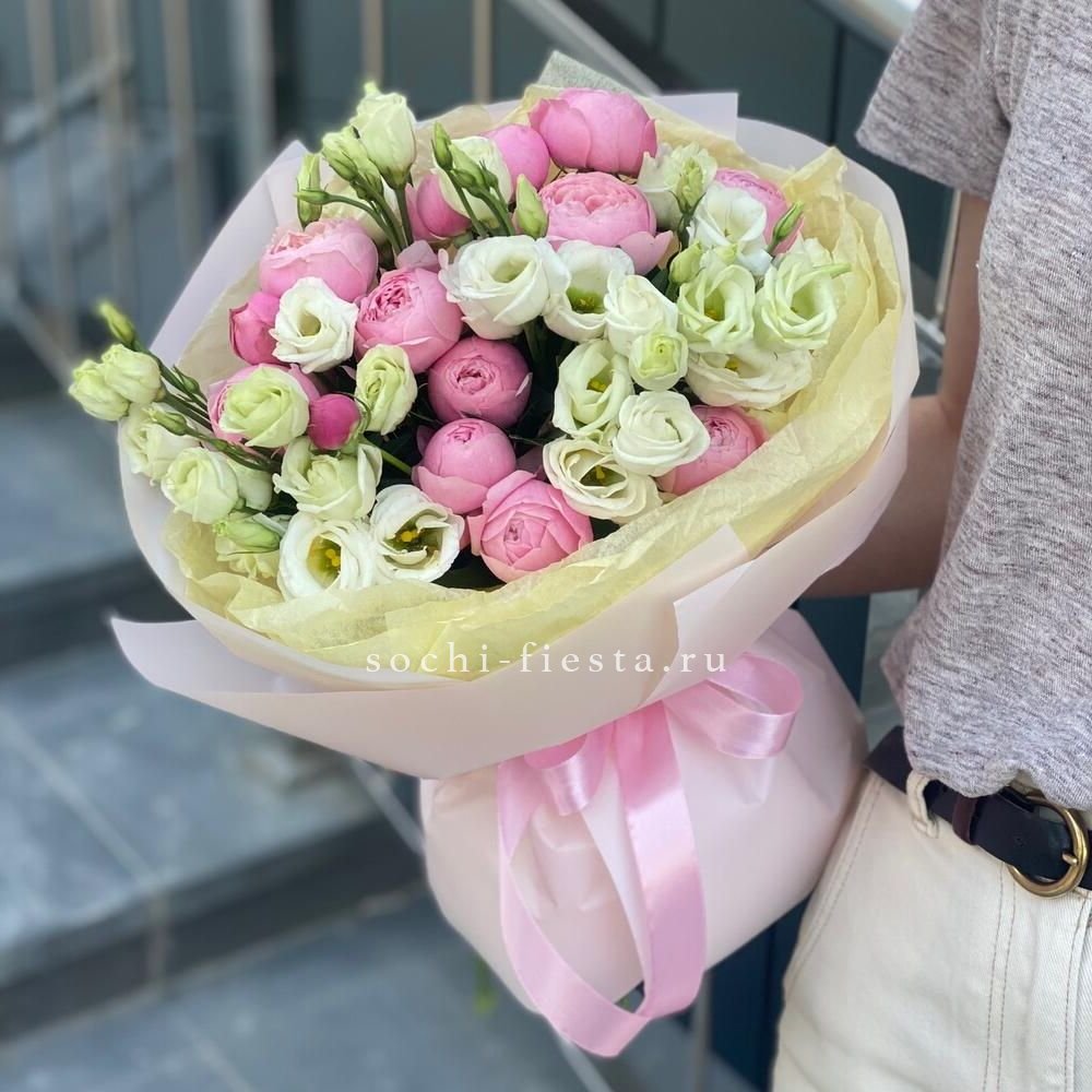 розы пионовидные 21шт, эвкалипт, пленка, лента.