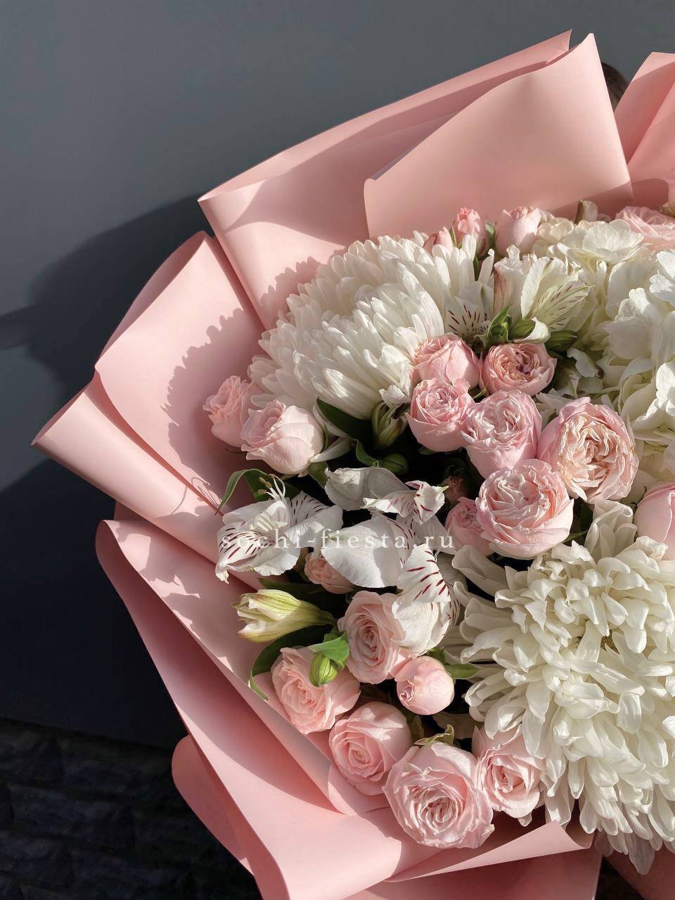 гортензия, одноголовые хризантемы, кустовые розы, альстромерии, лента и дизайнерская пленка.