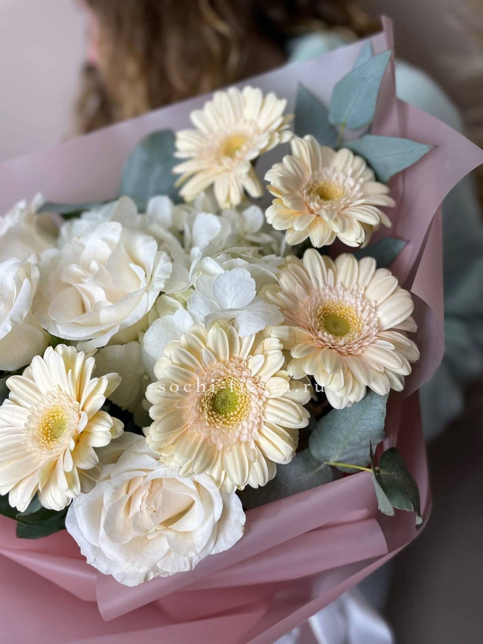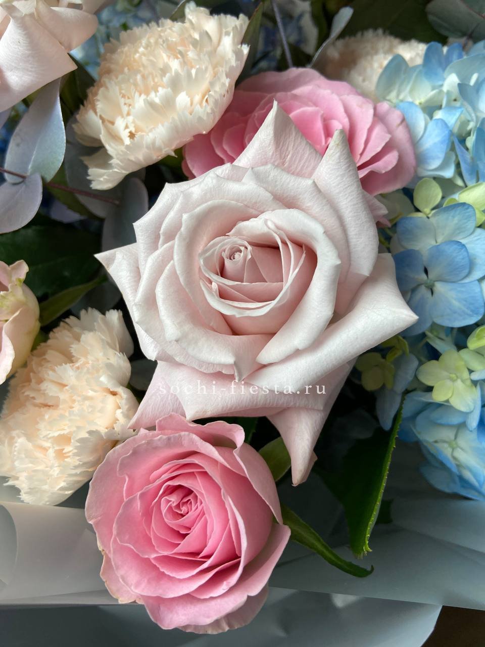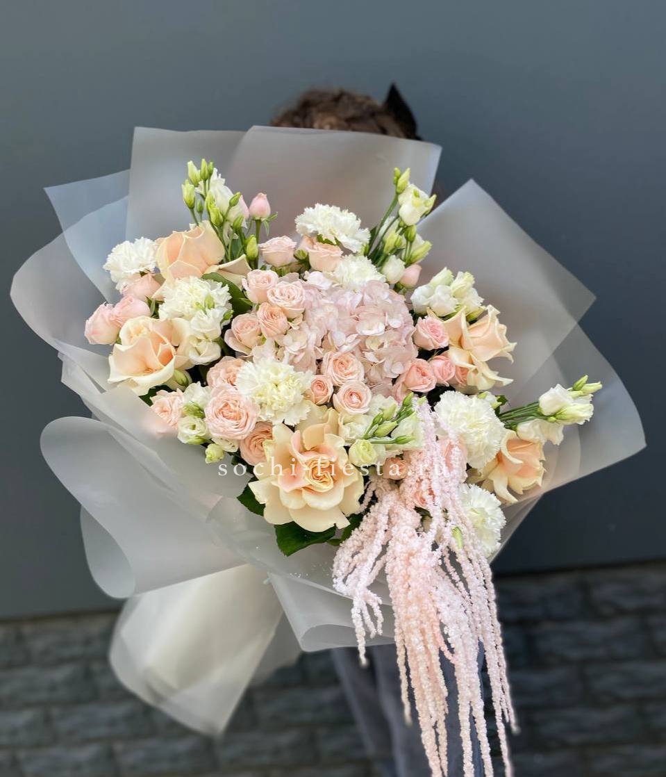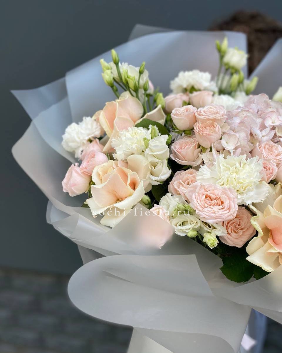 гортензия, роза, кустовая роза, диантус, эустома, дельфиниум, эвкалипт, лента, авторская упаковка.