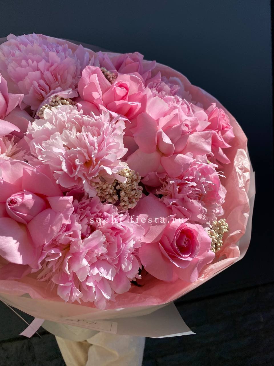 Плотные бутоны пионов собраны с розами в объёмную форму с мягким силуэтом. Озотамус добавляет воздушную текстуру по краям. Композиция в розовой гамме держит форму и выглядит цельно.