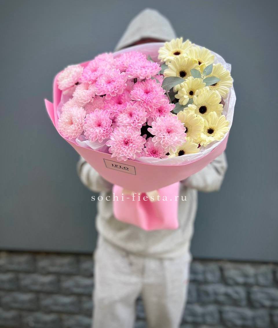 Солнечные герберы встречаются с пушистыми шапками хризантем в динамичной композиции. Веточки эвкалипта обрамляют цветы мягким зелёным контуром и придают свежесть.