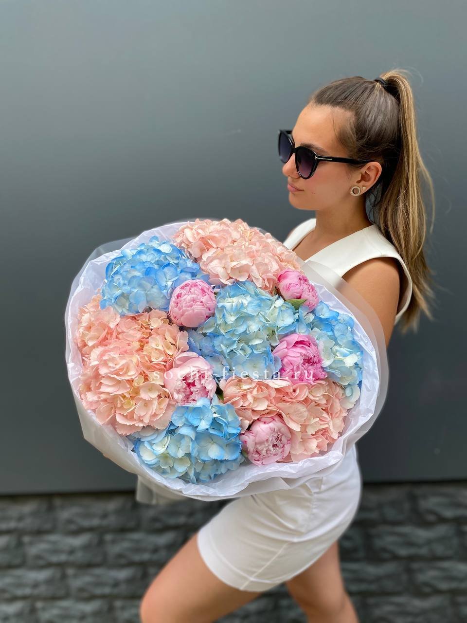 Два отдельных букета в одной композиции: пышные головки гортензий и густомахровые пионы. Каждая часть завернута в тишью и пленку, сохраняя свою форму и свежесть.