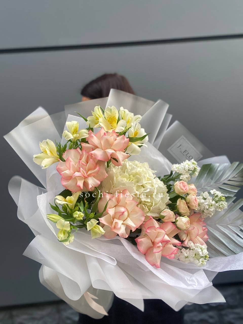 гортензия, пионовидные розы, пампасная трава (стифа), лента, дизайнерская упаковка.