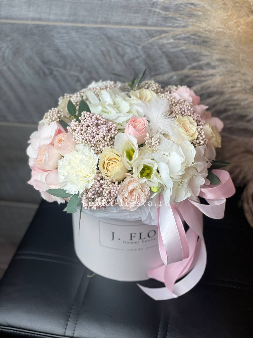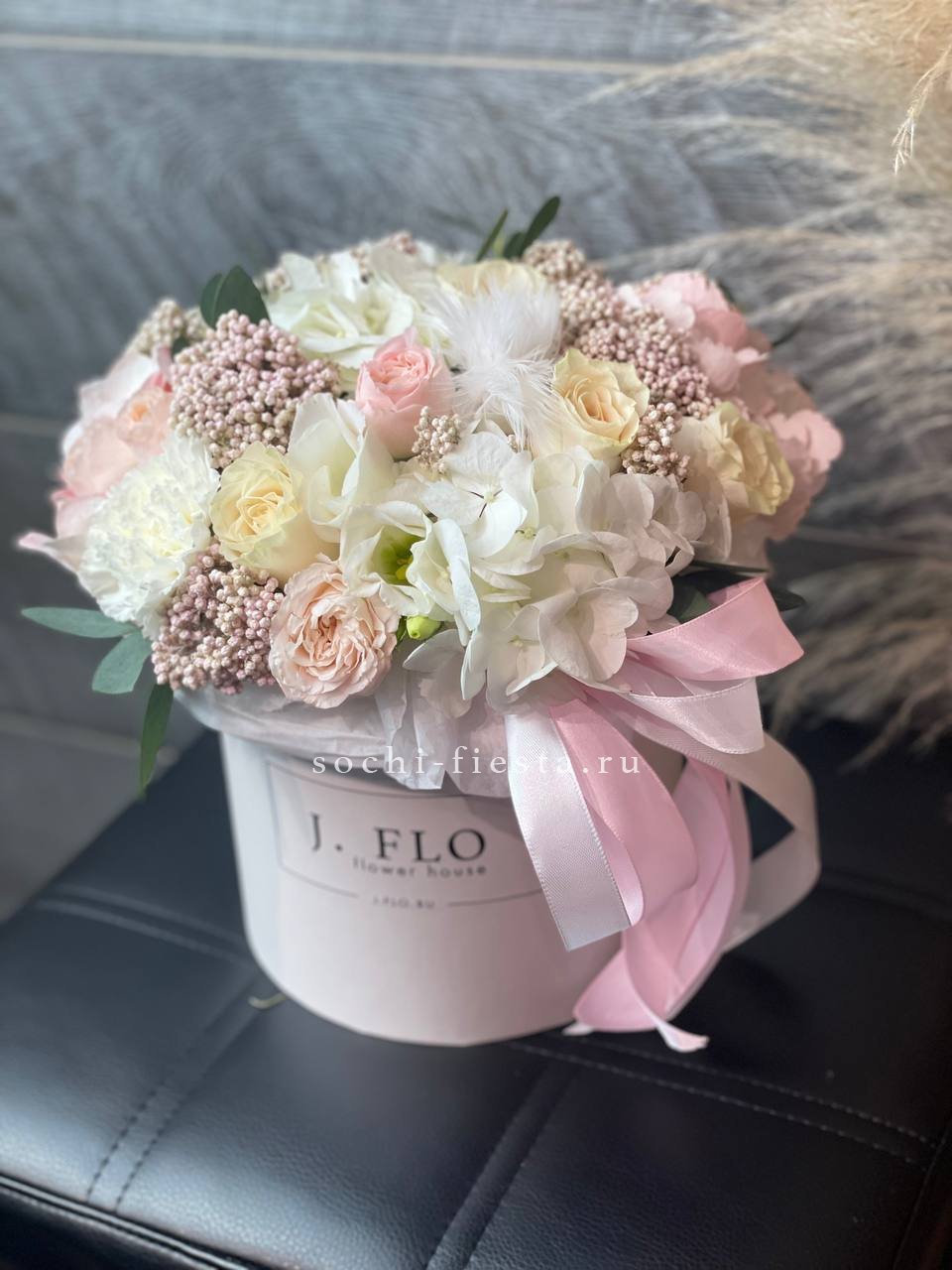 гортензия, пионовидная кустовая роза Мисти Баблс, лента, дизайнерская упаковка.