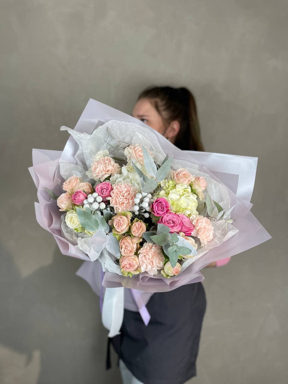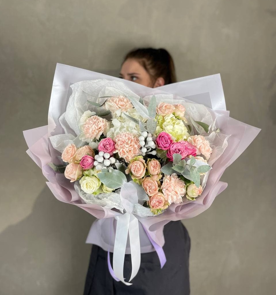 Диантусы и кустовые розы создают воздушную композицию с мягкими переходами оттенков. Бутоны распределены свободно, образуя естественный силуэт без жесткой геометрии. Букет хорошо держит форму и долго сохраняет свежесть.